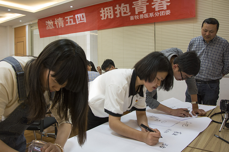 畜牧兽医系分团委在系多功能厅组织开展了纪念中国共青团成立94周年暨五四运动97周年“激情五四 拥抱青春”座谈会。大家分小组讨论了作为一名青年学子,该如何学好专业,为国家为社会贡献自己的一份力量!现场气氛热烈,学生发言积极,纷纷表示,要做一名合格的畜牧人,为畜牧事业贡献青春热血!