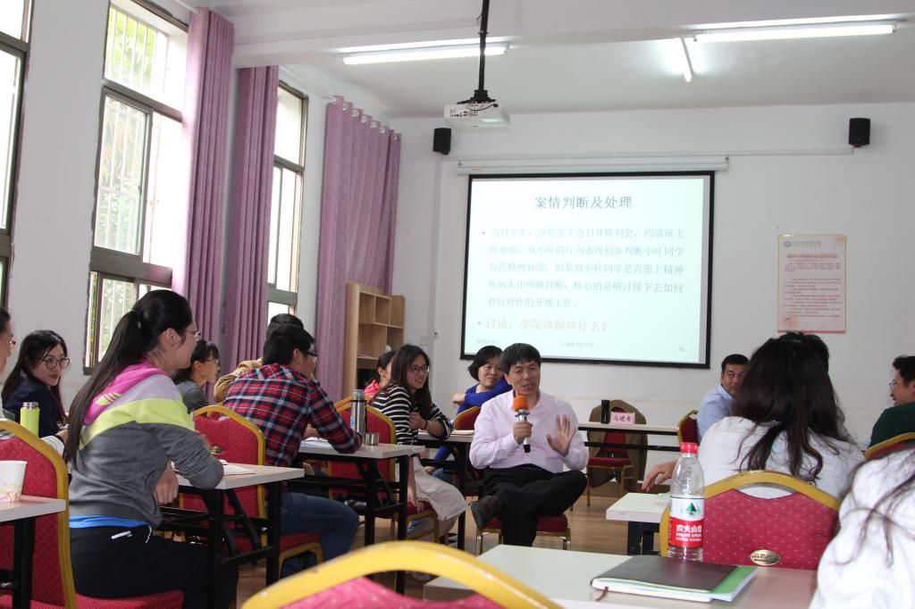 马教授采用案例教学法,通过大学生典型案例剖析,从理论到实务,从技术到管理,对我国大学生心理危机干预工作的现状、大学生心理危机的特征与信号、大学生常见心理疾病的判断、心理危机干预原则、危机快速反应机制、危机处置技巧和注意事项等内容进行了深入浅出地阐述,特别是培训中采用的情景模拟,使各位老师身临其境,换位思考,感知问题,进而找到解决问题的方法,给在场的老师们留下深刻的印象。