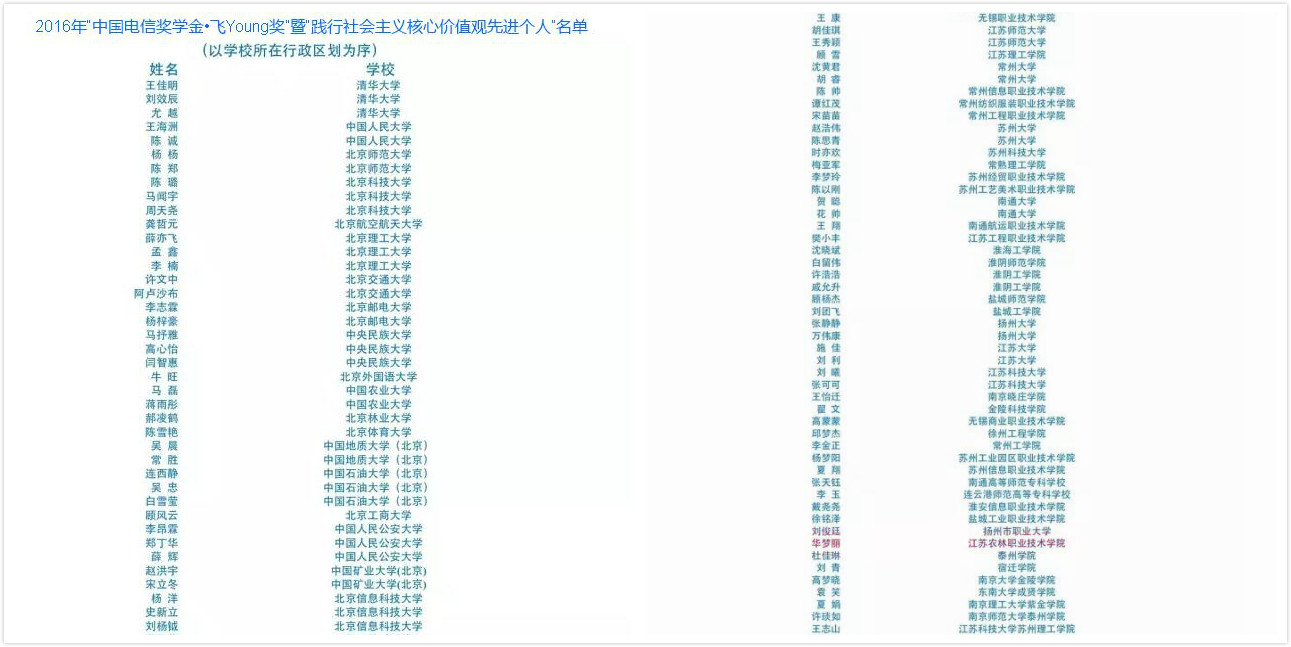 2016年“中国电信奖学金”暨“践行社会主义核心价值观先进个人”遴选寻访活动是贯彻落实习近平总书记系列重要讲话精神,在青年学生中深入开展培育和践行社会主义核心价值观活动的具体举措,旨在发挥优秀典型的示范带动作用,引领广大青年学生学习和践行习近平总书记“勤学、修德、明辨、笃实”重要要求,努力做有理想、有追求,有担当、有作为,有品质、有修养的“六有”大学生。