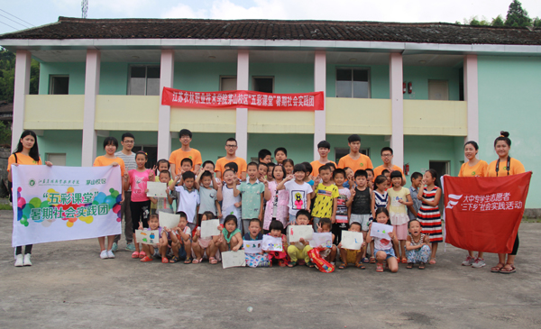 “五彩课堂”暑期社会实践队一行10人在茅山校区分团委周文炎老师的带领下赴温州公交希望小学进行了为期10天以“用青春力量践行雷锋精神、关爱农村留守儿童、关心山区农民生活、关注新农村建设状况、回报社会感恩社会”为主要内容的社会实践活动;深入贫困山区,以支教、扶贫、家访、座谈、义演等丰富的形式和内容,给当地的中小学生们送去了知识和温暖。她们满怀热诚,给山区孩子们带去一个精彩的假期。