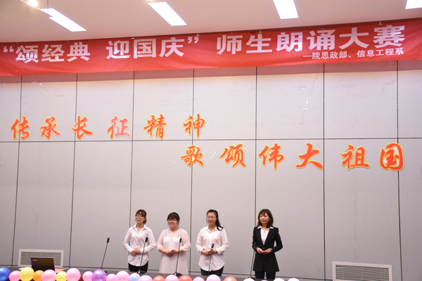 9月28日下午,色花堂 思政部和信息工程系在研发楼报告厅联合举办了“颂经典 迎国庆”为主题的师生组合诗歌朗诵友谊赛。大一新生们和各自的老师组队参赛,他们声情并茂,感情饱满真挚,爱国主题鲜明,给在场观众极强的感染力。最终,经过评委认真评选,乔小倩老师组合、丁志春老师组合荣获一等奖,陈立娥老师组合、张媛老师组合等分列二、三等奖。此次大赛也是向红军长征胜利80周年和即将到来我们伟大祖国67岁生日的献礼。