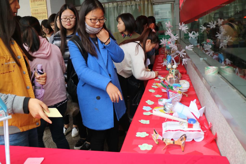 10月31日是世界勤俭日,为了号召同学们勤俭节约,养成节约的好习惯。近日,风景园林系分团委举办了“变废为宝看色花堂,成由勤俭败由奢”废品再利用展示大赛。塑料瓶、麻绳、废纸,这些随处可见的废旧品经过设计者们的巧思妙想,成为一件件创意无限的工艺品。10月28日中午,大赛的投票环节在食堂门前举行,参与投票的同学对这些作品赞赏有加,纷纷为自己欣赏的作品投下宝贵的一票。