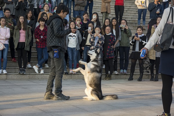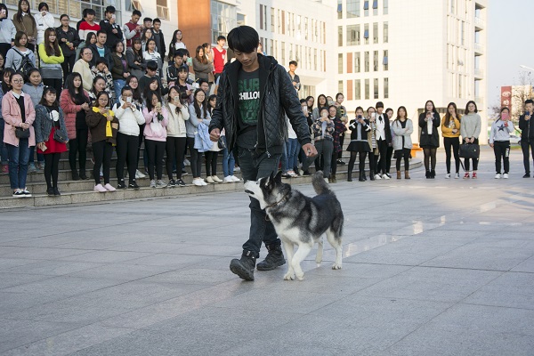 来自上海来宝犬业有限公司的潘青青从远古时代人类为何驯化狼作为帮手开始,分析了狼群的阶级分类,并深入浅出的讲解了犬主人训练犬只时与犬之间的身份地位的定位。潘青青是我院畜牧兽医系2014届优秀毕业生,从业近四年时间中,身经百战,多次携客户犬只在国内比赛中获得BIS级别成绩并完成中国登陆冠军(BIS是BEST IN SHOW全场总冠军的简称)。讲座最后,上海来宝犬业的金牌驯犬师黄智邦教练给同学们作了现场示范,如何让一只训练有素的哈士奇进行驯导展示。