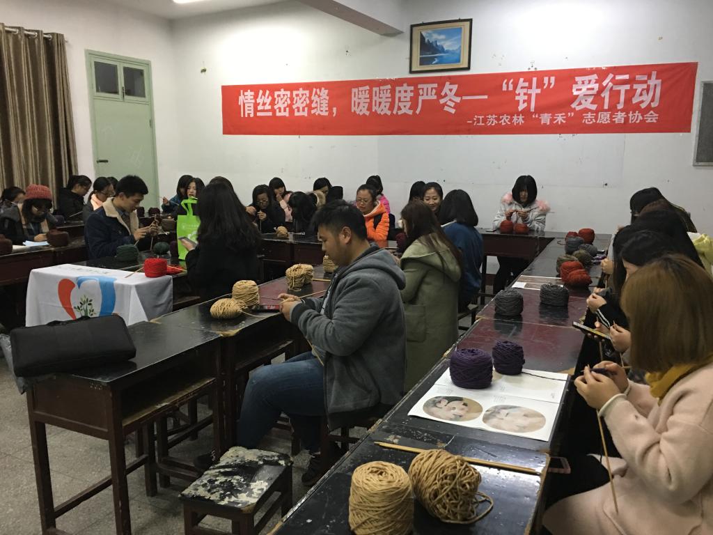 团委组织院学生会和“青禾”志愿者协会分别开展了感恩活动。上午7点,院学生会的同学们早早聚集在梧桐路旁,帮助阿姨清扫梧桐路段的落叶。同学们不畏寒冷,手持笤帚和簸箕等工具,将梧桐路的落叶清扫干净,给冬日的校园了增添一份靓丽的“人文”风景。晚上18点,“青禾”志愿者协会的志愿者们在理科楼教室内举行“情思密密缝,暖暖度严冬”——“针”爱行动。此次活动,共招募了50名校内志愿者,由院团委提供针、毛线、爱心卡片等所需物品,志愿者们认真学习针织围巾,围巾成品将送给句容市的孤寡老人。同时,色花堂