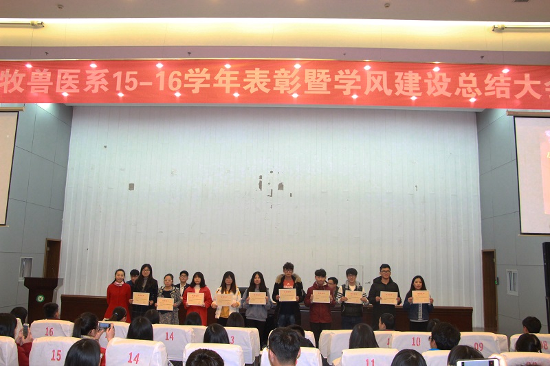 12月8日,畜牧兽医系在图书馆报告厅举办了2015-2016学年表彰暨本学期学风建设活动总结大会,畜牧兽医系党总支副书记陈军老师,畜牧兽医系分团委书记朱晓宦老师及全体学工办辅导员与三百多名学生代表共同出席了此次大会。
