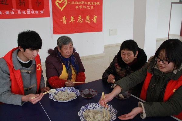 活动现场,志愿者们有的和爷爷奶奶们围坐在一起,唠家常,包饺子,不一会儿,热气腾腾的饺子就端到了桌上,志愿者和老人们在欢声笑语中品尝着劳动的成果,其乐融融;志愿者们还给老人们表演了精彩的魔术,让他们开怀大笑;活动最后,志愿者将包好的饺子和亲手写的对联送到了社区其他老人的家中,表达了对老人们深深祝福。