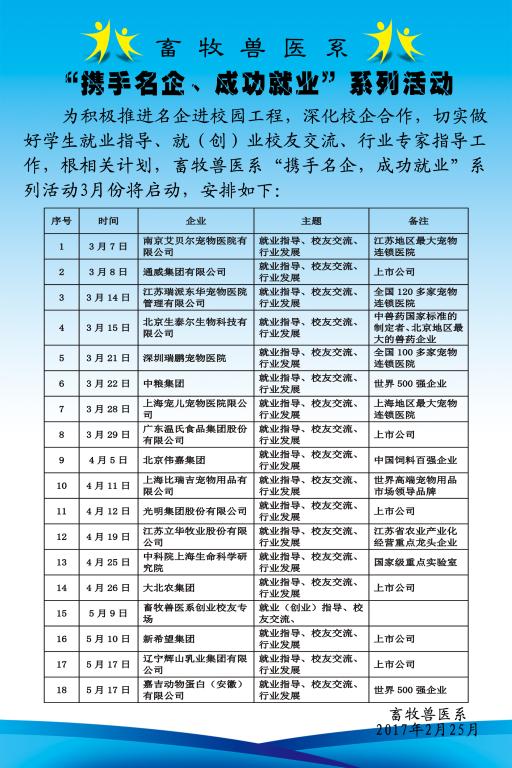 据悉,畜牧兽医系在2月至5月期间,将邀请20多家行业内知名企业走进校园,为在校学生提供就业(创业)指导、就业(创业)校友交流、行业发展交流服务。