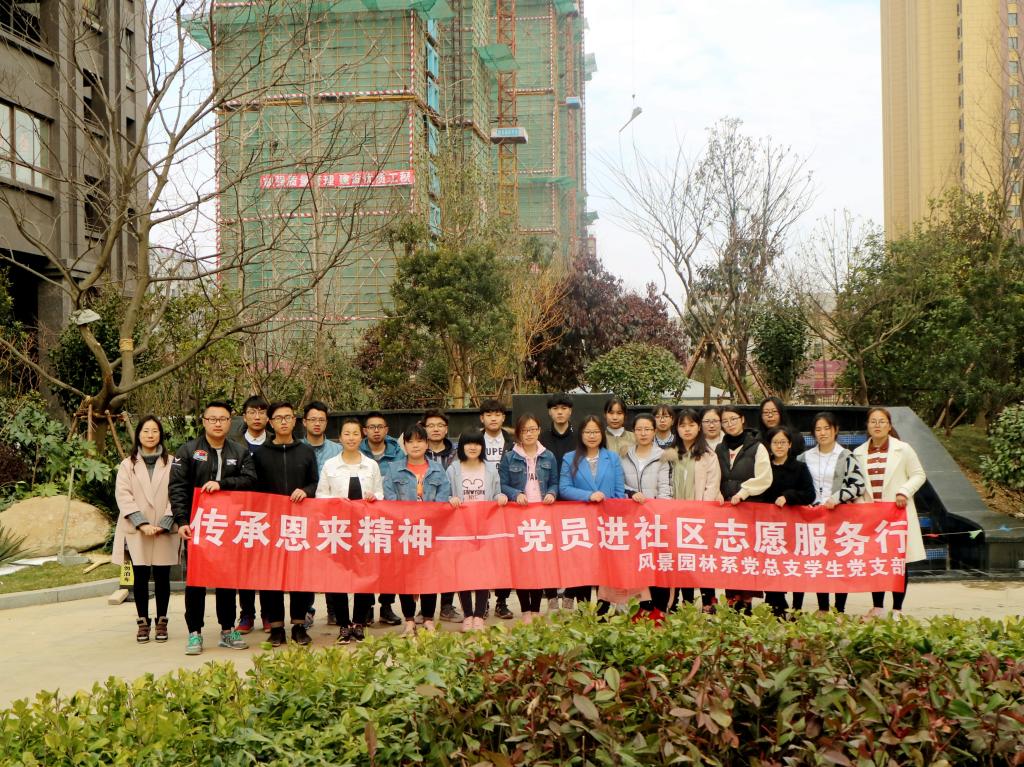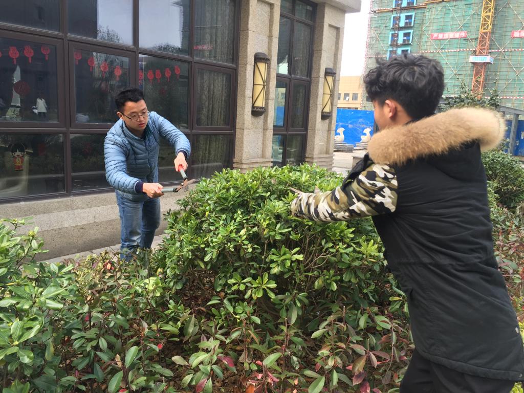 为增强学生党员服务意识,锤炼大学生实践技能,推进社区文明建设,3月15日下午,风景园林系学生党支部组织学生党员、发展对象来到句容市崇明社区香江丽景小区开展“传承恩来精神——党员进社区志愿服务行”活动。志愿者们分工明确,将在校所学的专业知识和技能应用到实践中来。有的同学拿着修枝剪、绿篱修剪机,对小区的绿化进行修剪,有的同学清理花坛中的枯枝。