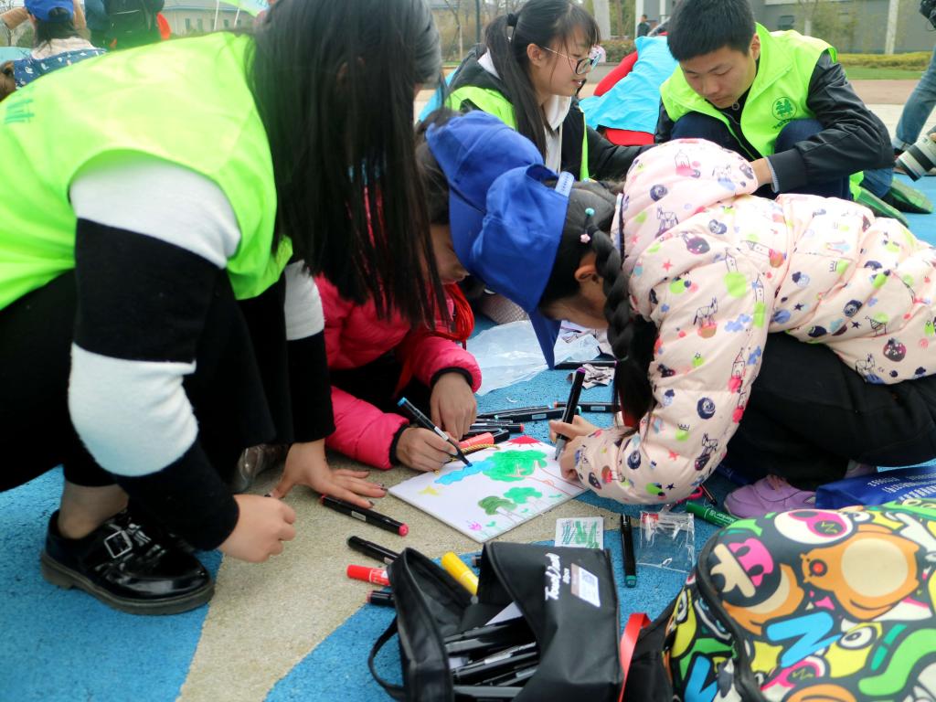 大小志愿者们自由分组,席地而坐,利用废旧的KT板、不穿的衣物,开动脑筋,在纸板上尽情发挥创造力,共同完成了环保宣传画的制作,并将爱林护林的宣传画挂在了公园里已经被摧残的小树上。