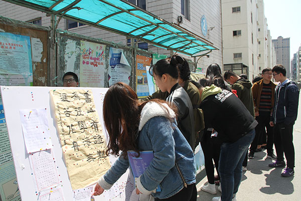 为了丰富校园文化生活,推动宿舍文化建设,3月27日,农学园艺系7栋、10栋大学生社区管理服务站在食堂门口开展了“承艺术语言,展公寓文化”书法展活动。