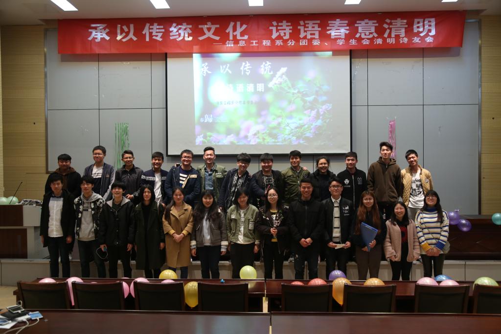 信息工程系分团委、学生会于3月31日19:00在研发楼报告厅开展“承以传统文化、诗语春意清明”诗友会。全系100多名诗歌爱好者积极参与到活动中。活动现场,抑扬顿挫的音韵、熟悉的佳句引领现场观众在古典诗词中感悟传统文化的律动之美。此次活动的开展不仅丰富了学生的校园文化生活,还激发了他们对祖国灿烂文化的自豪感,更促进了他们对传统文化的喜爱。