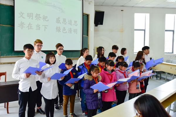 3月29日下午,茅山校区分团委联合春城实验学校的师生开展了以“文明祭祀 感恩追思孝在当下 绿色清明”为主题的教育活动,共300余名师生参加。活动开始,小学生进行了《弟子规》入则孝篇朗诵,随后,茅山校区的学生们带来了精心准备的歌唱《跪羊图》,那轻柔的旋律,朴实生动的歌词,细腻的旁白,触动了在场的所有人。