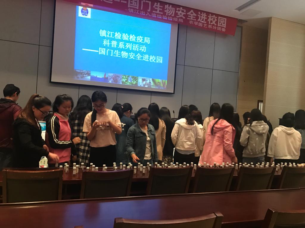 活动中,镇江出入境检验检疫局精心准备了国门生物安全宣传展板和检验检疫人员截获的违禁物品标本,并向参加讲座的师生发放国门生物安全知识宣传手册,受到了同学们的热烈欢迎。专题讲座中,工作人员制作图文并茂的PPT课件,通过大量的图片、数据和典型事例深入浅出地讲解了“外来生物入侵、传播的途径、造成的危害以及我们怎么办”等4个方面的内容。同学们听得认真,看得仔细,不断提问,积极了解检验检疫知识。