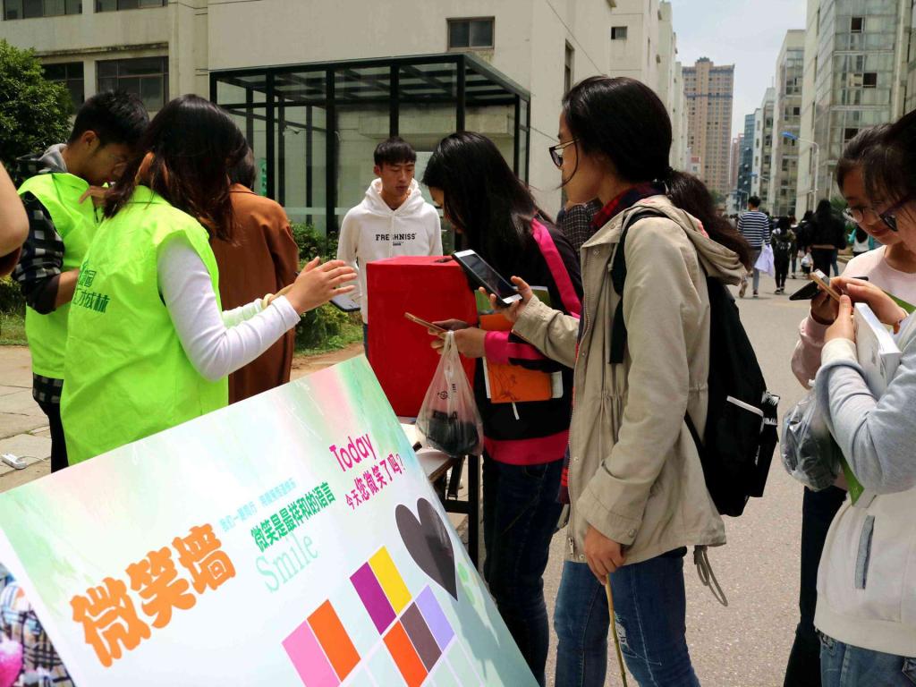 5月5日,为迎接世界微笑日,风景园林系在食堂门口举办了“微笑点亮生活,爱心照亮世界”爱心接力活动。