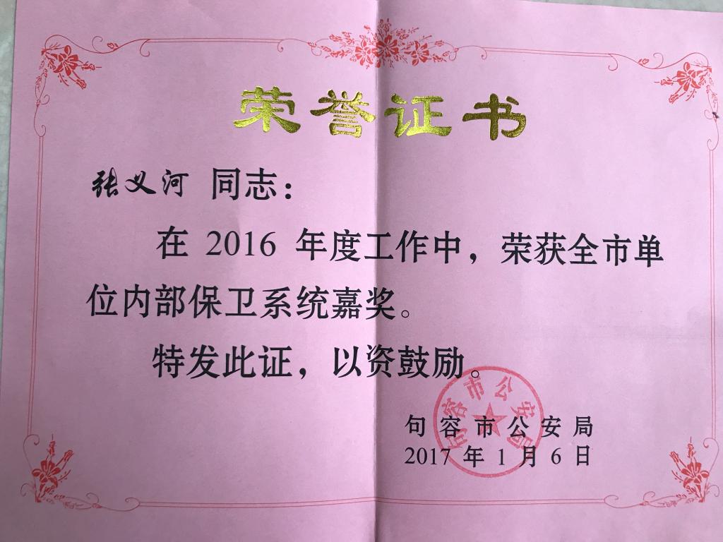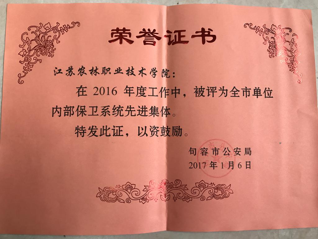 日前,句容市公安局发布了《句容市关于表彰2016年度全市单位内部保卫系统先进集体和先进个人的决定》(句公〔2017〕2号),我院被授予“句容市单位内部保卫系统先进集体”,我院张义河同志获“句容市单位内部保卫系统嘉奖”。