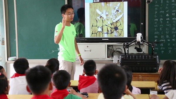 其中机器人科普知识授课模块由周伟老师主讲,从留守儿童的视角,运用幽默风趣的动画演示,带引孩子们走进机器人的世界,了解机器人工作原理,探索科技力量,启迪留守儿童树立科技强国梦想。7月1日,是中国共产党第96个建党节,“唱党的歌、颂党的情”课程模块由志愿者教授留守儿童革命歌曲,孩子们用歌声表达了对党的生日祝福。党员志愿者们通过和留守儿童分享自己的入党历程,讲党的故事,带领留守儿童学习党的知识,引导留守儿童热爱和拥护中国共产党,立志做共产主义接班人。在“无人机的飞行表演及体验”课程模块中志愿者通过简单易懂的理论教授和易操作的无人机飞行表演及体验更好地激发了留守儿童对科技探索的兴趣,加深了留守儿童对前沿科技的了解。
