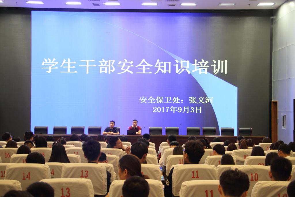 党总支副书记乔小倩老师和心理健康教育中心主任周玲老师为学生干部们做了题为《新时期高校学生干部的责任与担当》和《沟通技术在学生干部工作中的运用》的报告。安全保卫处张义河老师则通过播放视频、授课、实战演习等方式给学生干部们上了一堂安全教育课。