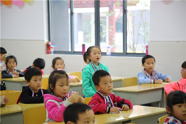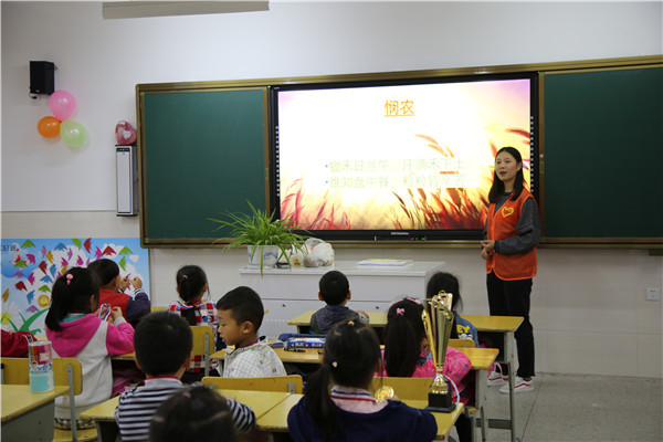 的“小菁人”志愿者们来到崇明小学文昌校区一年级五班开展“节约一粒粮食,我们在行动”主题活动。