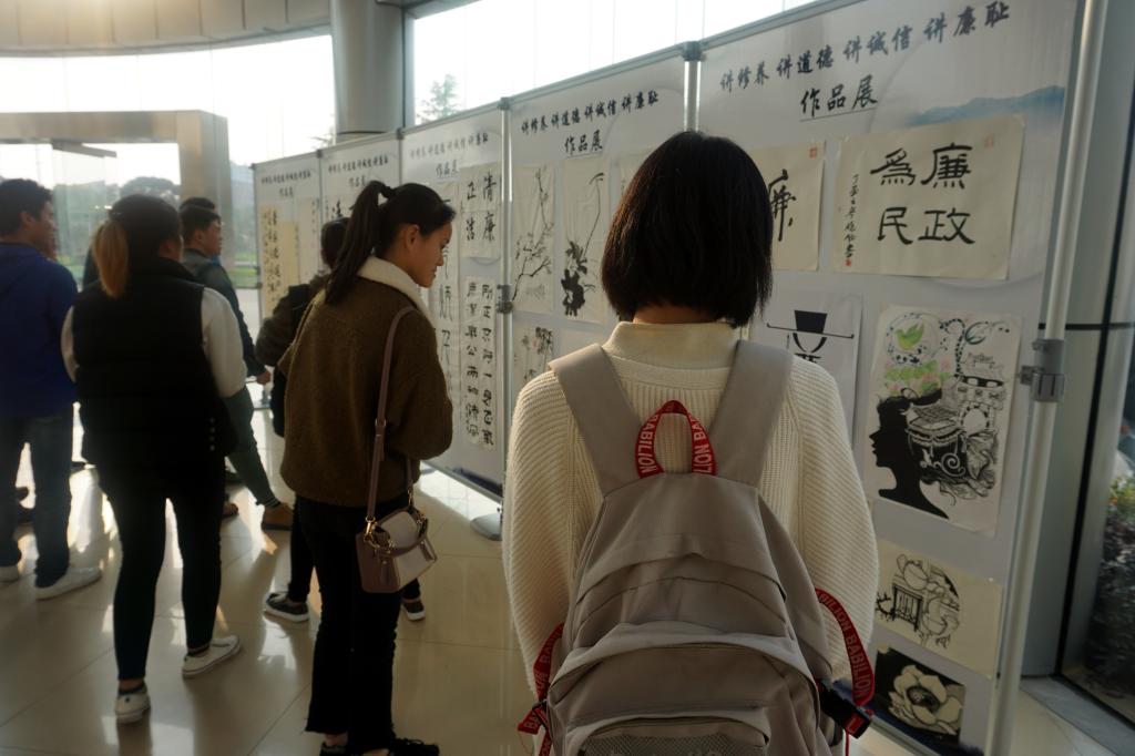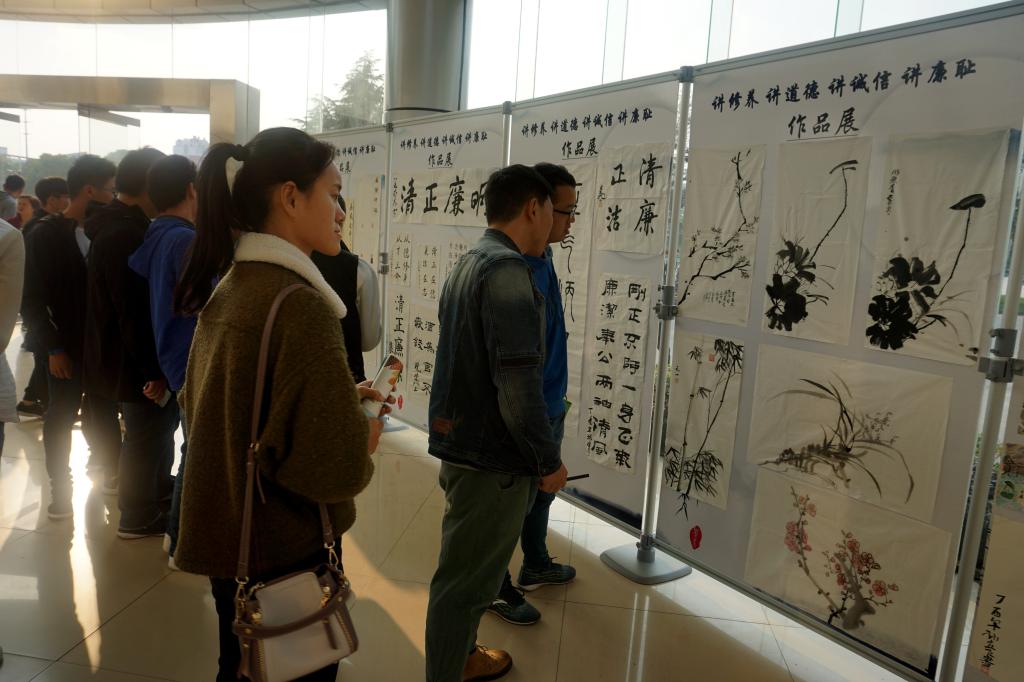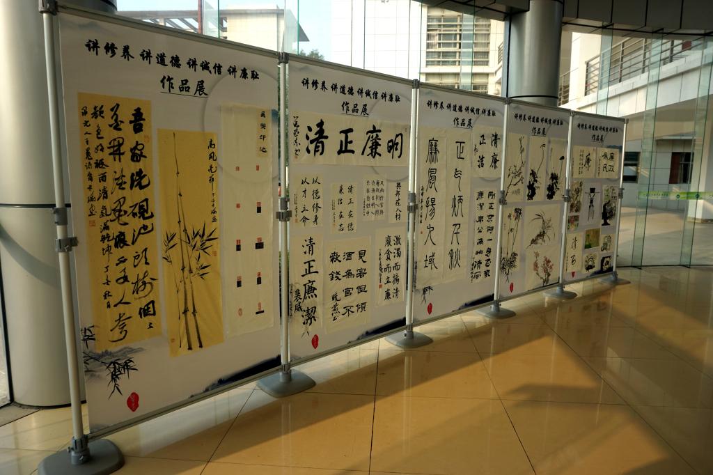 承办的“讲修养·讲道德·讲诚信·讲廉耻”廉政书画作品展在J1教学楼举行。此次展出的廉政书画作品共30余幅,其中风景园林色花堂