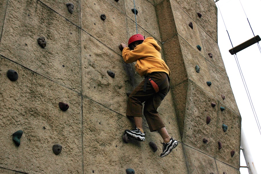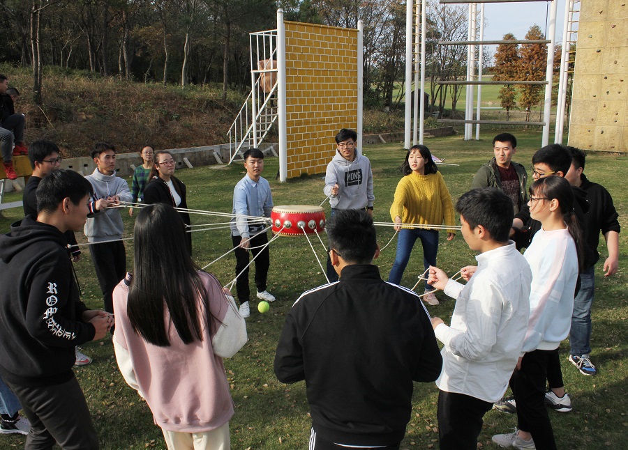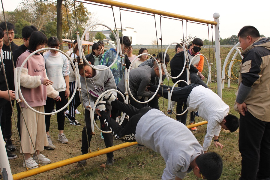 拓展训练过程中,指导老师通过“纸牌分队”的方法把全体学生干部分为两个队,两队进行了“拉鼓弹球”、“穿越电网”和“极速150秒”三个项目的大比拼,每个同学都使出了浑身解数,把自己队伍的力量发挥到了最大化,也使得大家懂得了团队的重要性,个人想要成功就必须建立在团队其他成员的共同努力与共同支持的基础之上。最后,“攀岩”活动让大家体验了勇气与耐力的极限挑战。