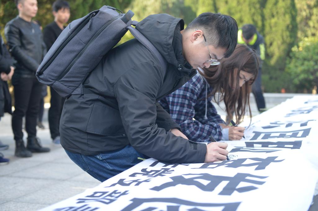 仪式上,同学们唱国歌、诵祭文、温誓词,寄哀思。在党的十九大胜利召开的一年,在全面建成小康社会的决胜之时,同学们深切感念老一辈无产阶级革命家浴血奋战,不畏牺牲的献身精神,缅怀在南京大屠杀惨案中罹难的三十万同胞,同学们纷纷在悼词条幅上庄严签名,立下成才兴邦之志。