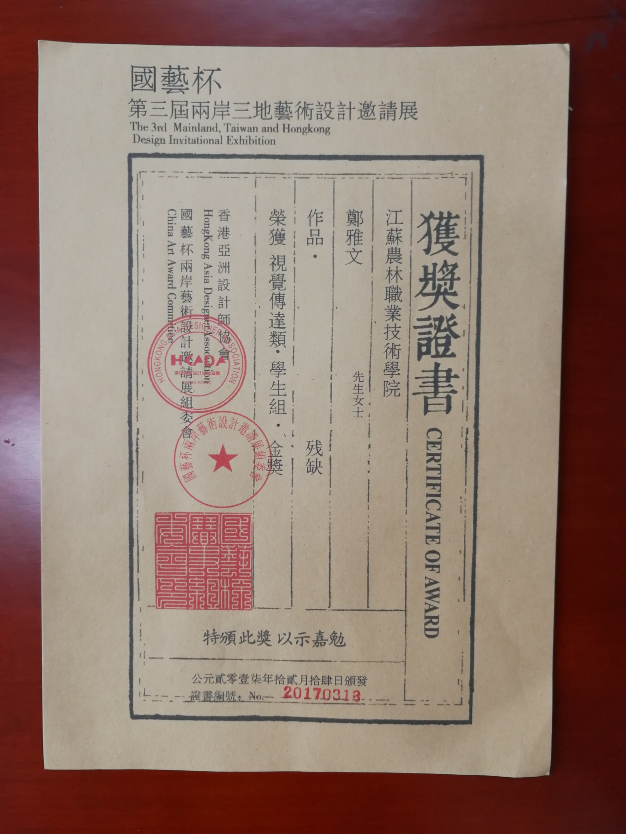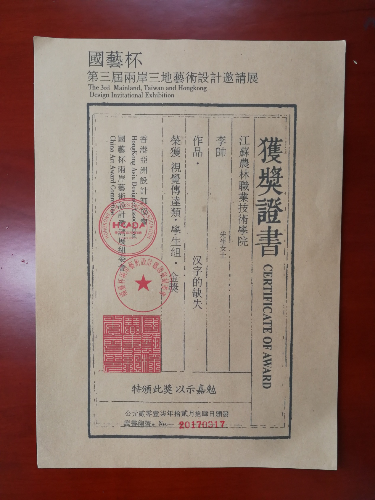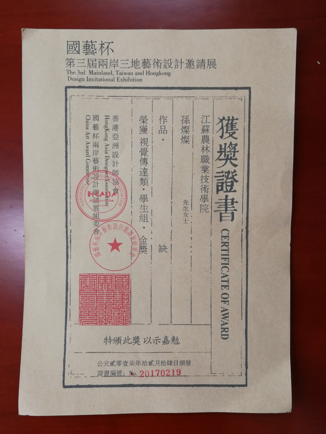“国艺杯”比赛由香港环亚国际设计师协会(ADA)主办,主旨是促进海峡两岸和谐共荣、两岸设计创意理念的创新、文化交流,使两岸艺术文化交流融合不断创新,评审专家由多国艺术家、教育家和设计师等联合组成。