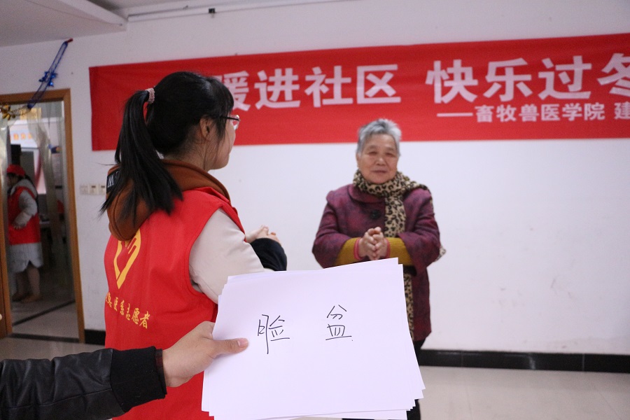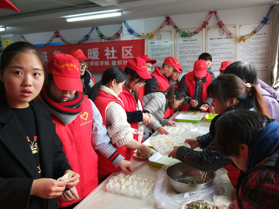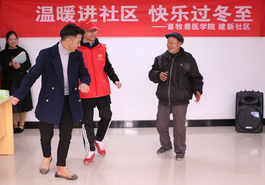 同学们不但为老人们带来精彩的表演,还邀请老人们一起参加互动节目。藏族同学教老人们跳藏族舞蹈,用藏语说“身体健康万事如意”。通过“击鼓传花”,邀请老人参与“你演我猜”活动,现场一片欢声笑语。表演后,同学们与老人们一起包饺子,煮饺子。吃过热腾腾的饺子,还为老人们戴上了爱心手套,让老人们暖暖的度过这个冬天。活动后,同学们还将煮好的饺子送到社区的孤寡残疾人家中,让他不出门也能感受到暖暖的冬至。