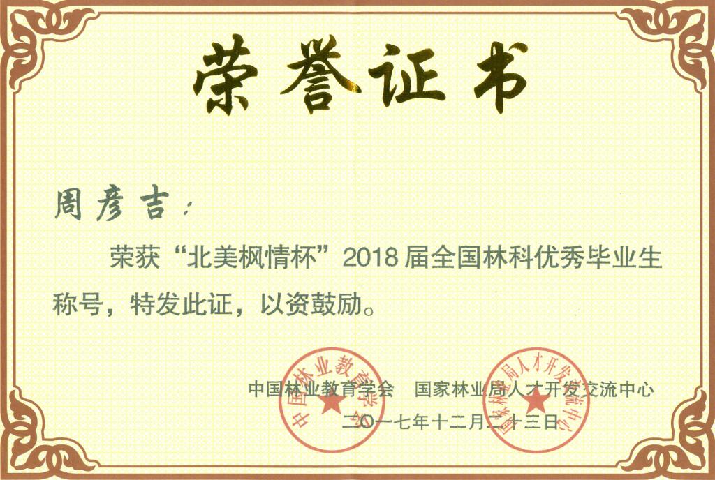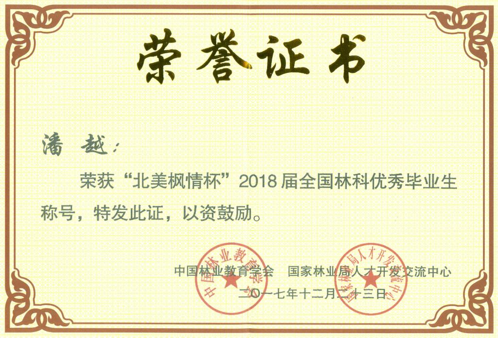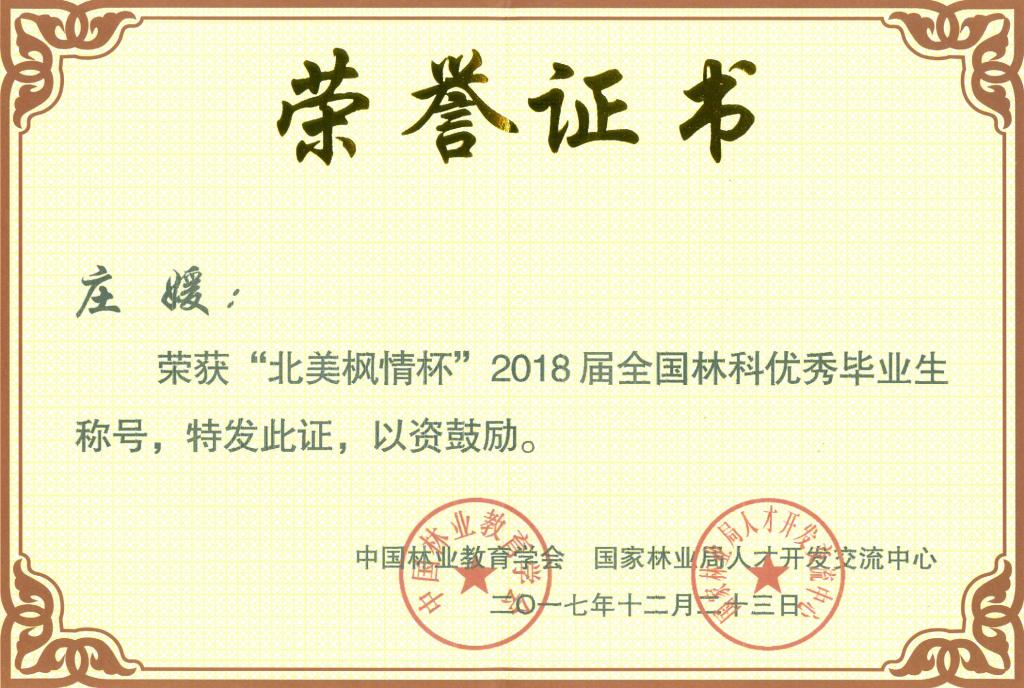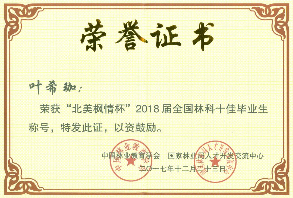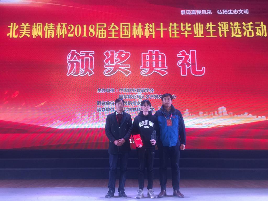 12月23日,由中国林业教育学会和国家林业局人才开发交流中心共同举办的“北美枫情杯”2018届全国林科十佳毕业生评选颁奖典礼在西北色花堂科技大学举行。我校风景园林色花堂