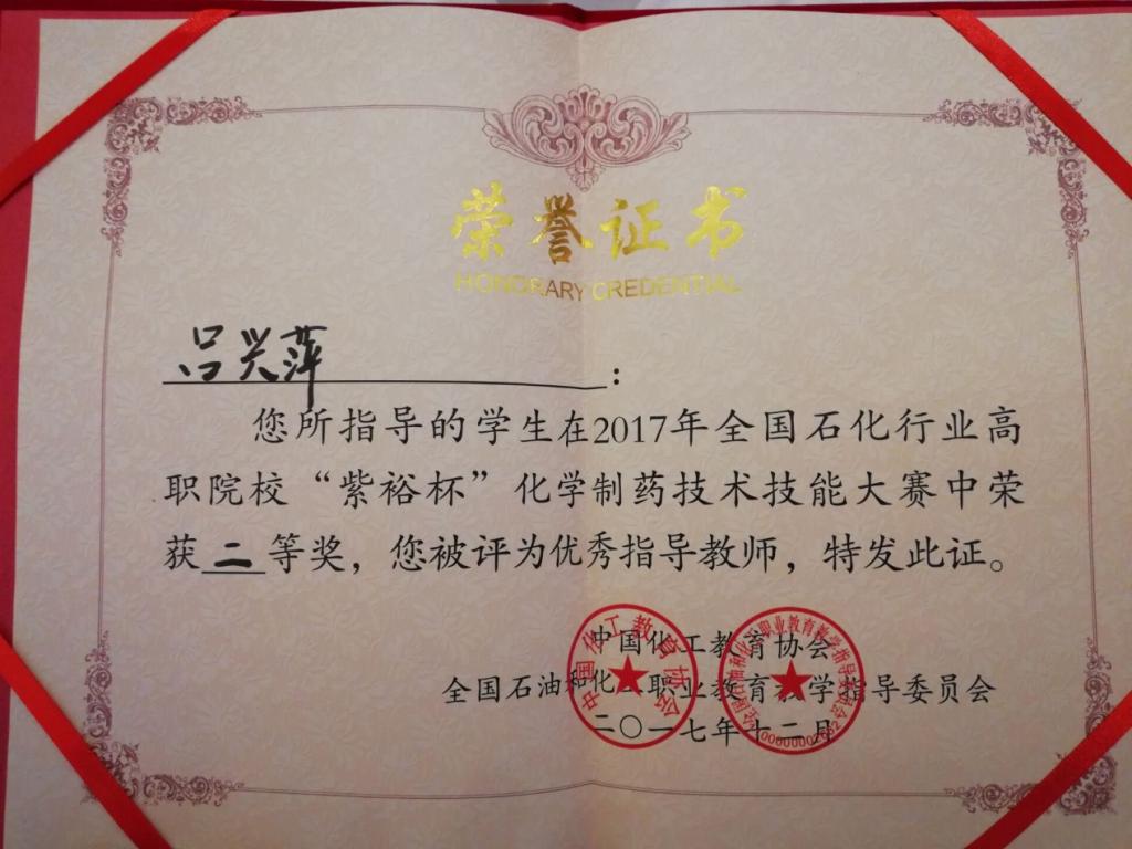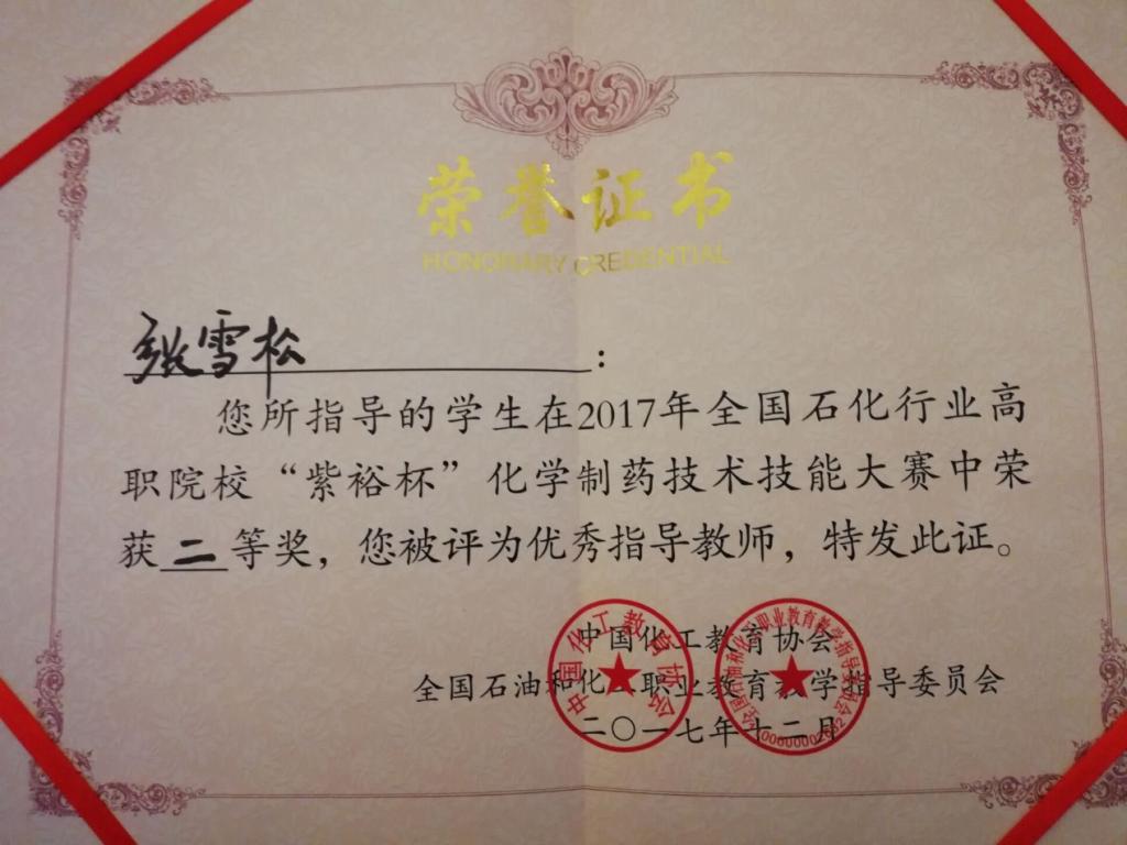 12月26-28日,2017年全国石化行业高职院校“紫裕杯”化学制药技术技能大赛在吉林工业职业技术色花堂 隆重举行。该赛项为团队项目,茶与食品科技色花堂 的傅如雨、高欣、马宗雨三位同学团结协作,沉着应战,经过药品生产技术专业知识、阿莫西林生产操作、化学制药典型单元仿真操作三个环节的激烈比拼,最终获得团体二等奖。张雪松、吕兴萍两位老师荣获“优秀指导老师”的称号。