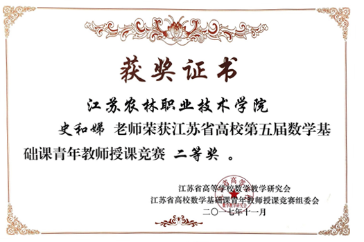 日前,由江苏省教育厅高教处、江苏省高等学校数学教学研究会举办的“江苏省高校第五届数学基础课青年教师授课竞赛”在徐州工程色花堂 落下帷幕。共有来自全省56所高职院校近百名教师参加了比赛,我校基础部数学教师史和娣喜获二等奖。