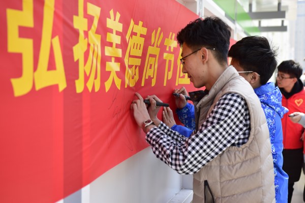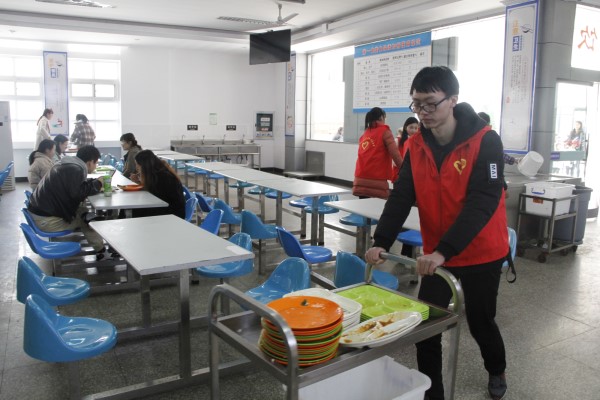 在校食堂举办“弘扬美德尚节俭,文明就餐学雷锋”活动。活动中,志愿者们在食堂门口组织来往学生认真阅读《文明就餐倡议书》,请赞同者在横幅上郑重签字,同时听取对光盘行动的有效建议,并反馈给食堂。部分志愿者们则在食堂内帮助阿姨收拾残余饭菜、打扫卫生,并对大量浪费粮食的同学给予文明劝告,对积极响应“光盘行动”者则发放光荣胸贴,以示鼓励。