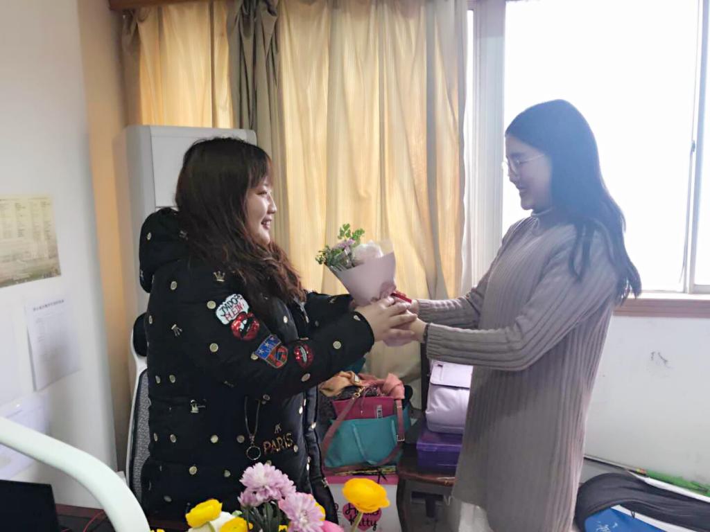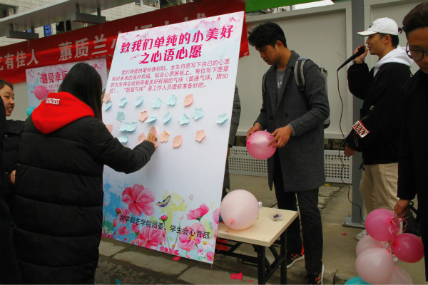 在师生食堂门口举办了以“四海八荒,独宠她”为主题的女生节关爱活动。此次活动分为“爱她写出来”、“爱她说出来”、“爱她化出来”三个环节,通过心愿快递、随机采访、妆扮美丽三个小活动,给参加活动的女生们送上了节日的小惊喜和温馨的祝福。除此以外,学生们还为女教师们准备了节日花束,祝愿女神们的生活像花儿一样美丽绽放。