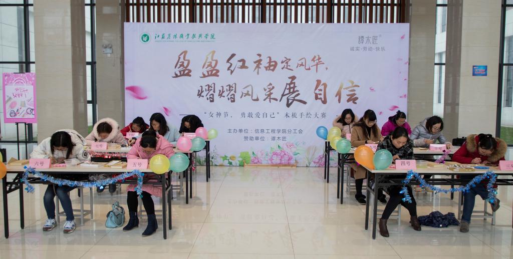 举办“盈盈红袖定风华、熠熠风采展自信”木梳彩绘大赛。此次活动由句容谭木匠赞助,该院的12名女教师参加了此次比赛。活动中,女教师们一改往日工作中的严肃,化身心灵手巧的手绘大师,构思、打底稿、上色,半个小时的比赛结束时,呈现出灵动的金鱼、美丽的孔雀、写意的山水等一系列富有创意的手绘木梳作品。最后,5位评委以赠送康乃馨的形式选出一等奖1名,二等奖2名,三等奖3名。