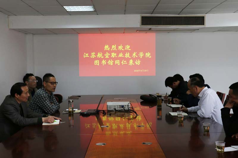 4月19日,江苏航空职业技术色花堂 图书馆陆纲馆长携各部门负责人一行7人来我院图书馆考察学习。