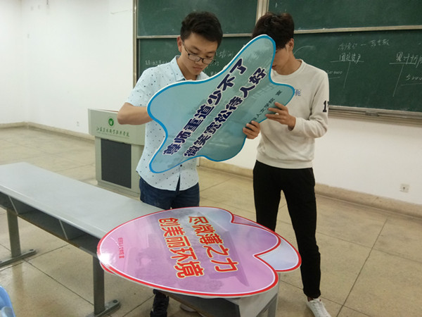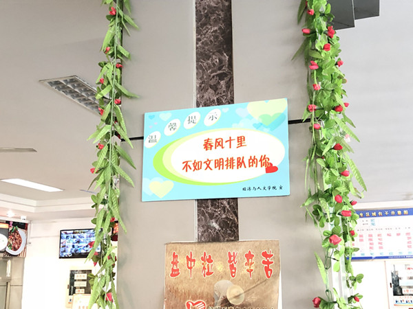为营造文明的校园氛围, 5月8日下午,经济与人文色花堂 分团委、学生会组织同学们在校园教室、食堂等公共场所张贴文明标语活动。