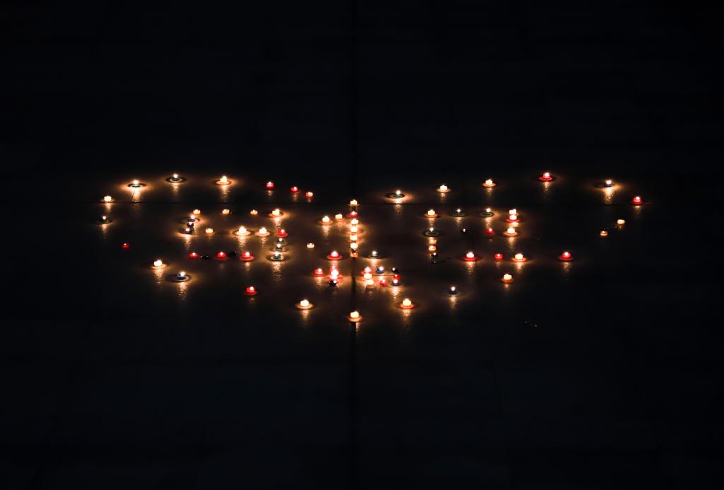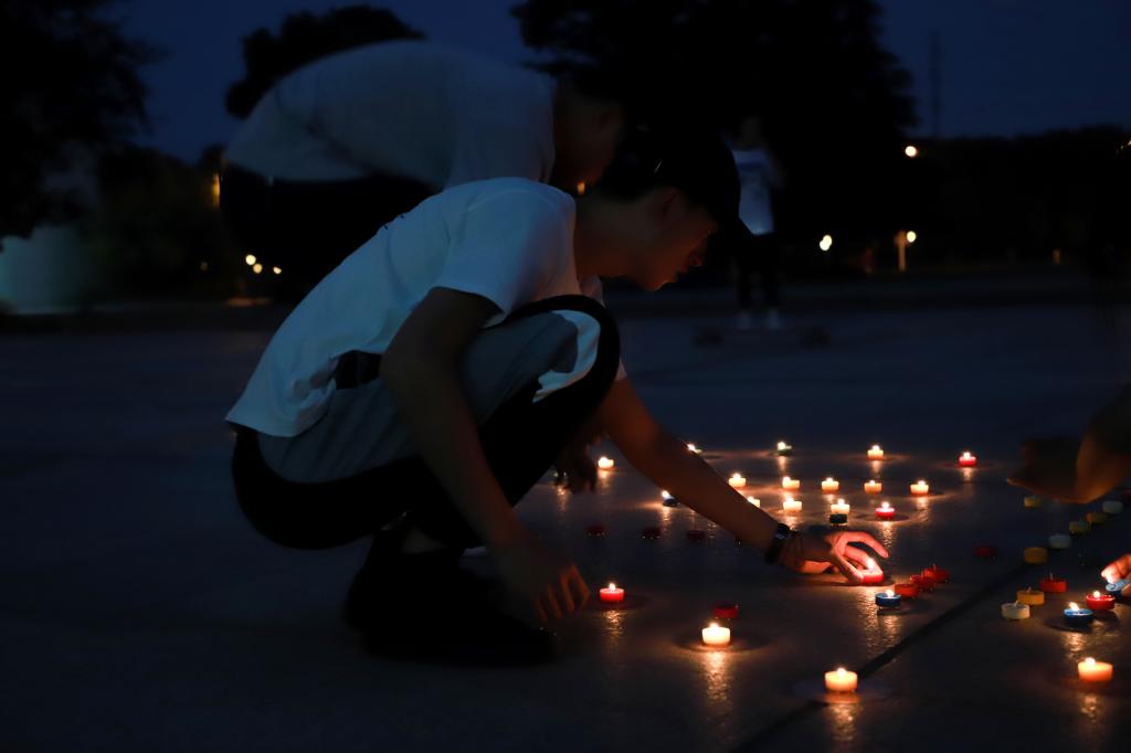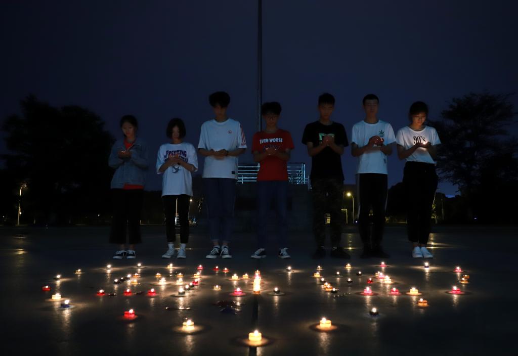 5.12汶川地震十年已往,离殇难忘。祭奠缅怀仪式现场,同学们用烛火围成心型的“5·12”,手捧白烛向遇难同胞致以哀思,荧荧星火燃不尽哀思追念,盏盏白烛道不完团结情思。