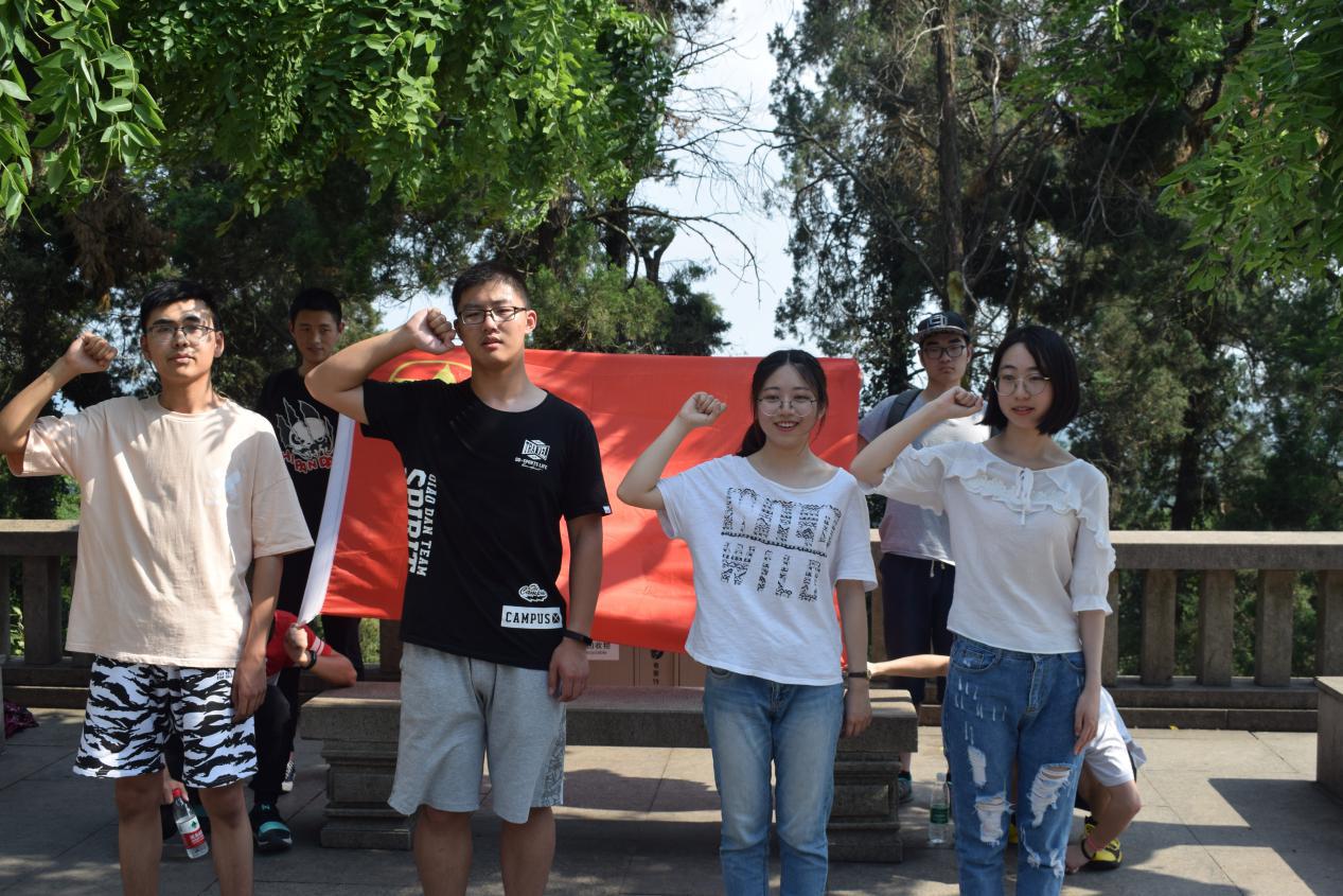 师生且行且论,对中山先生的生平、事迹、功勋、身后等进行了许多讨论,对中山陵的缘起、建筑、林木等进行了广泛交流。大家穿过牌坊,拾级而上,并排队在祭堂有序参观。在祭堂旁的树荫休憩时,团支书带领班级几名优秀学生代表在团旗下宣誓明志。