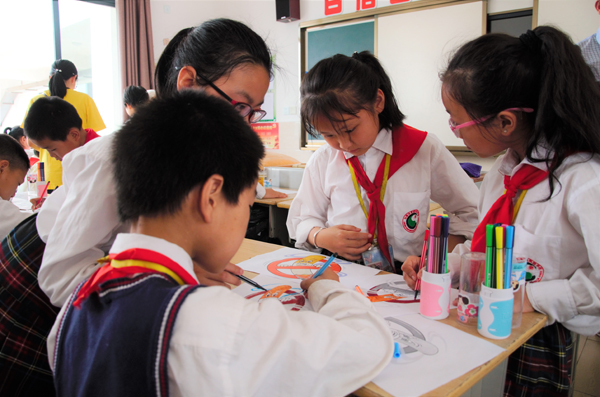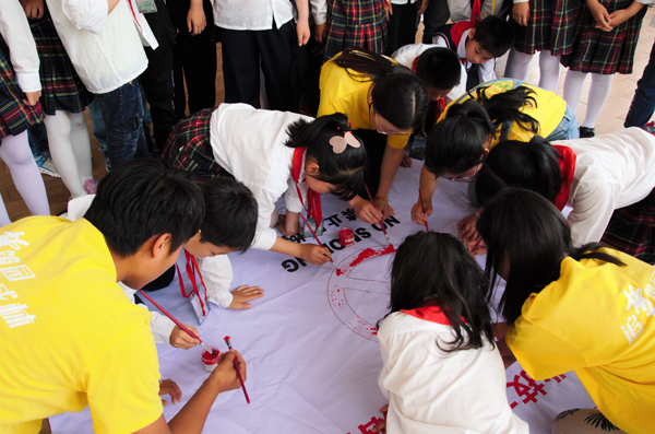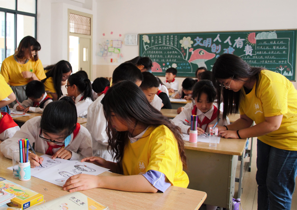 活动中,学生志愿者用图文并茂的PPT、简单精彩的“禁烟手指舞”等通俗易懂的形式为小学生们介绍吸烟对人体的害处,通过几个禁烟示范性动作,让小学生了解如何拒绝吸二手烟或如何劝阻他人吸烟。志愿者们海利用废弃矿泉水瓶、香烟、吸水纸等材料做香烟燃烧实验,实验结果显示水变浑浊,吸水纸变黄,更加直观地展示了吸烟对人健康的危害。最后,大小学生携手共绘禁烟标识,主题画形式多样,构思巧妙,颜色多彩,教育意义鲜明。