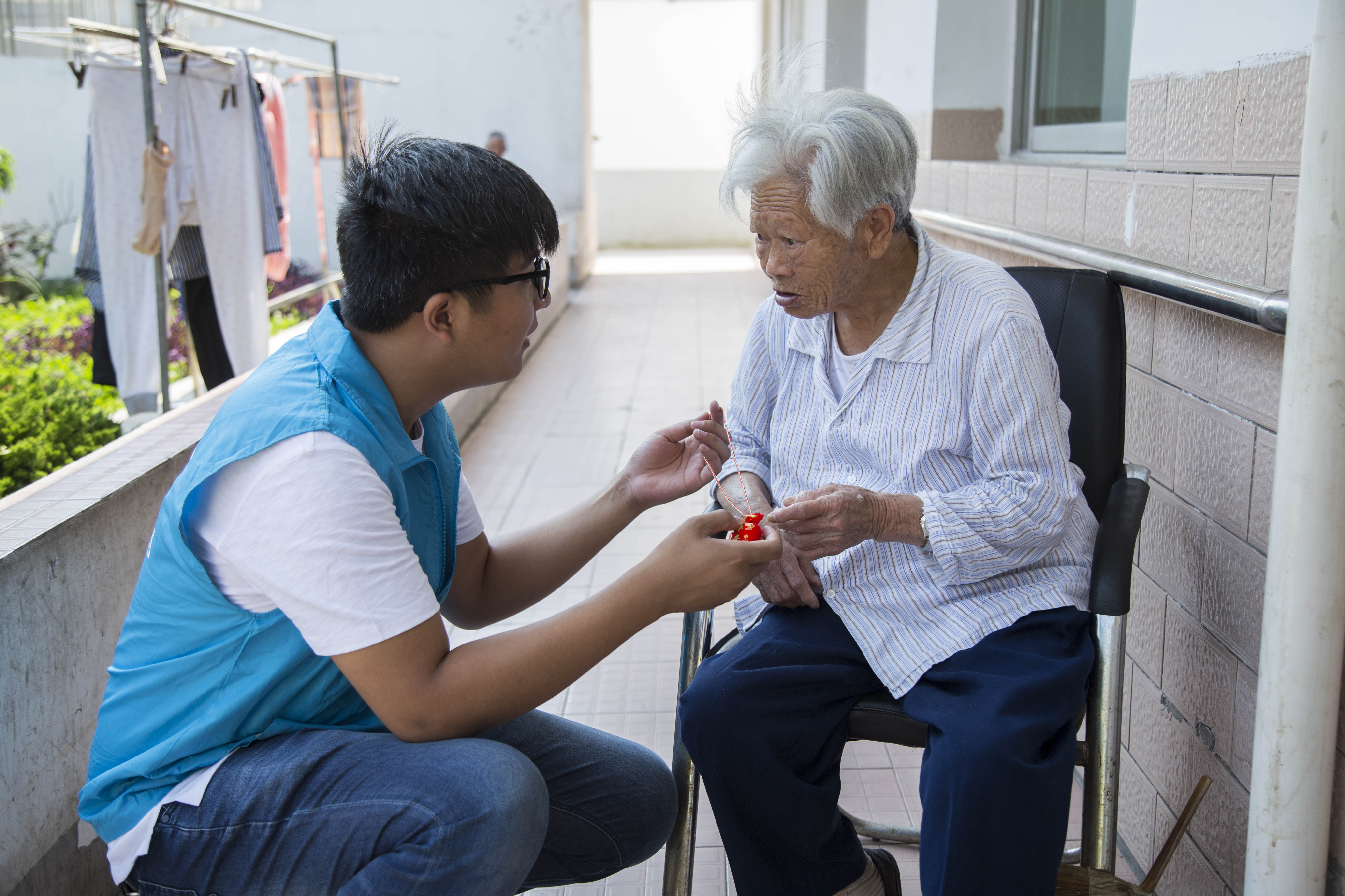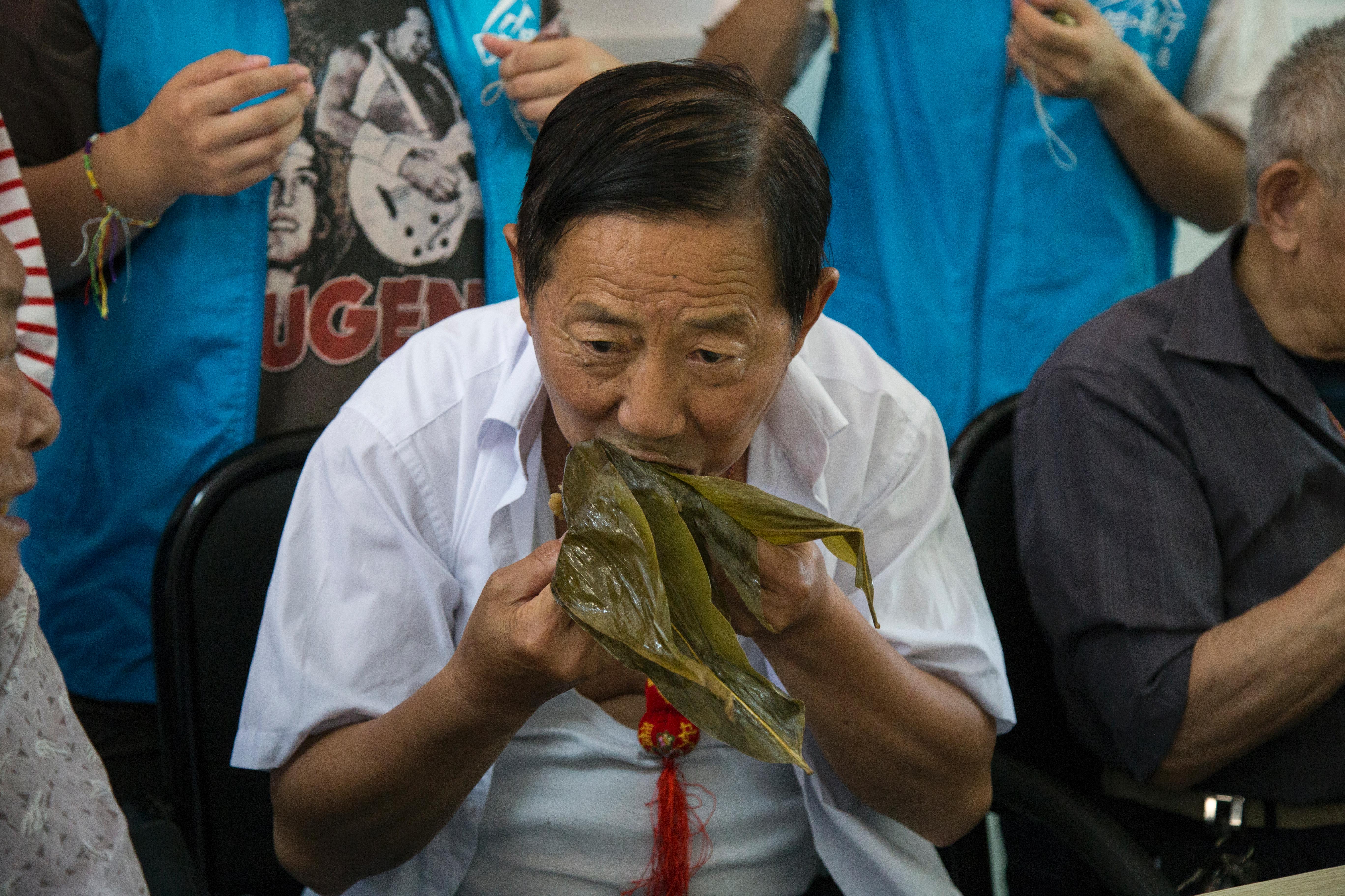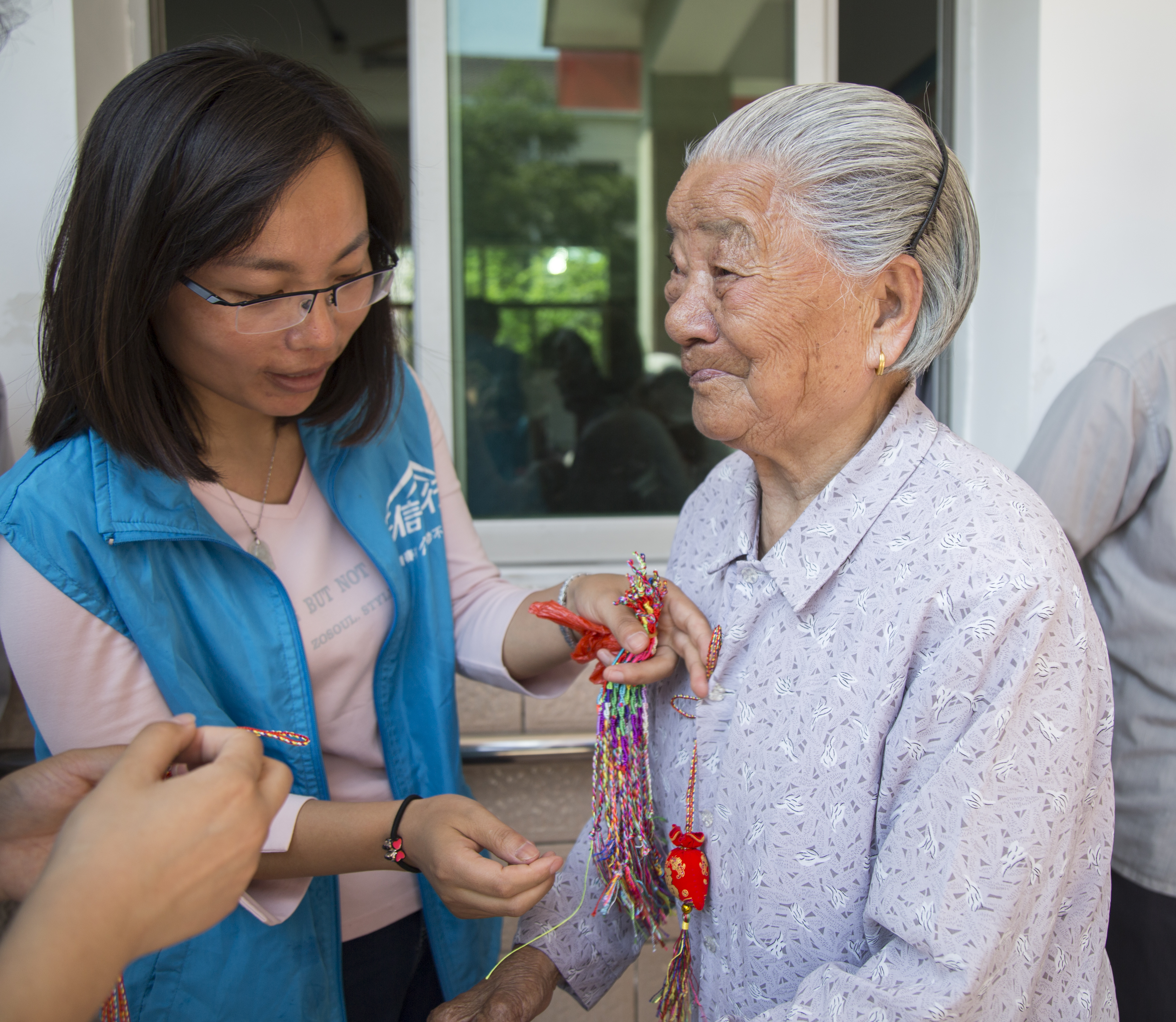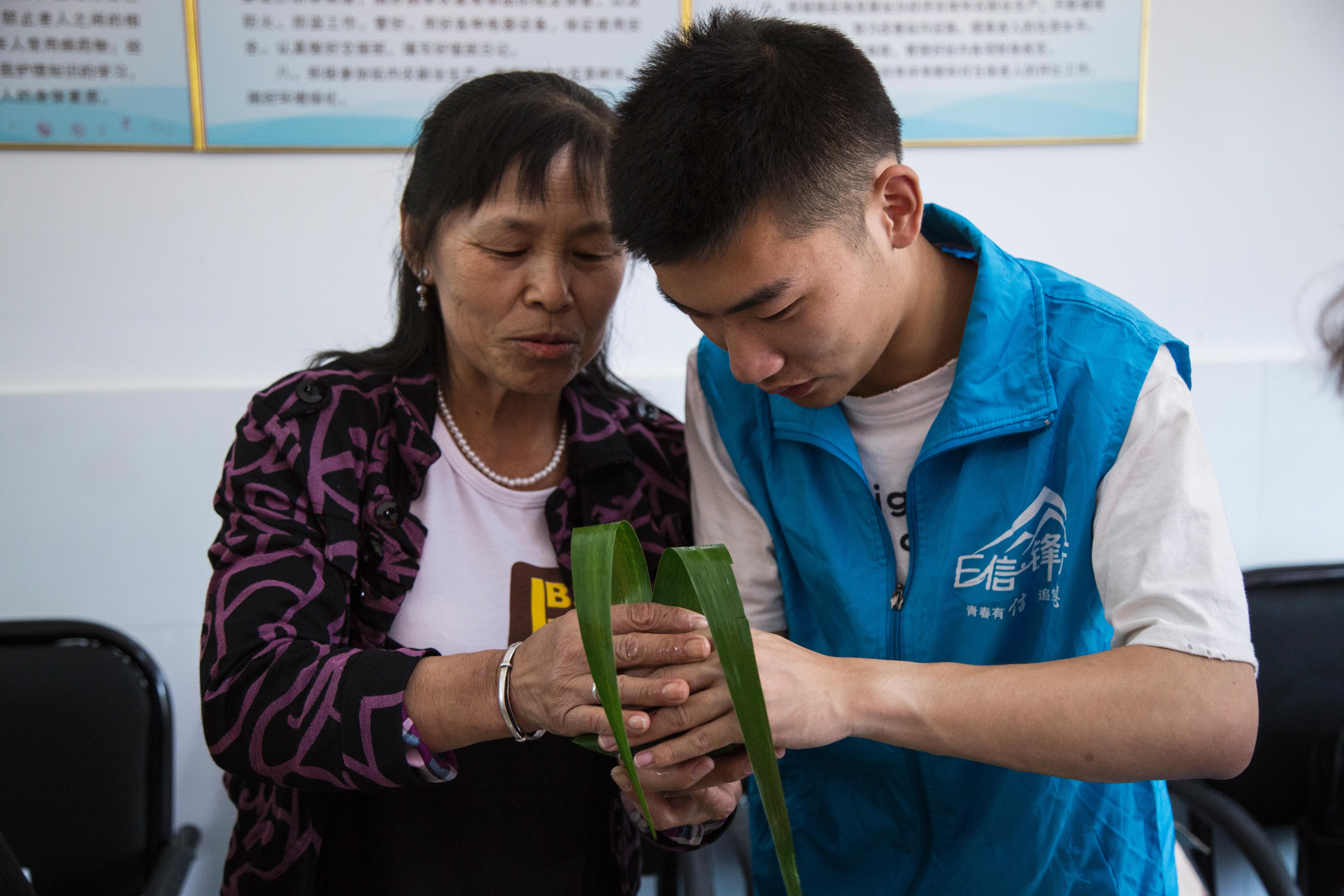 活动中,志愿者们一边听爷爷奶奶讲端午的传统故事和习俗,一边在他们的指导下包各种样式的粽子,大方粽、小脚粽、迷你粽……粽叶在老人们的手里不停的飞舞,一会儿工夫,就包好了一筐。在蒸煮粽子的间隙,志愿者们为老人佩戴上精心准备的中药香囊,帮助老人们去暑防蚊,老人们也为志愿者系上五彩绒线,寓意健康成长。带着香囊,系着绒线,大学生志愿者和老人们围坐在一起,志愿者随性一曲《女驸马》,老人们打着节拍哼唱着,现场气氛温馨从容。