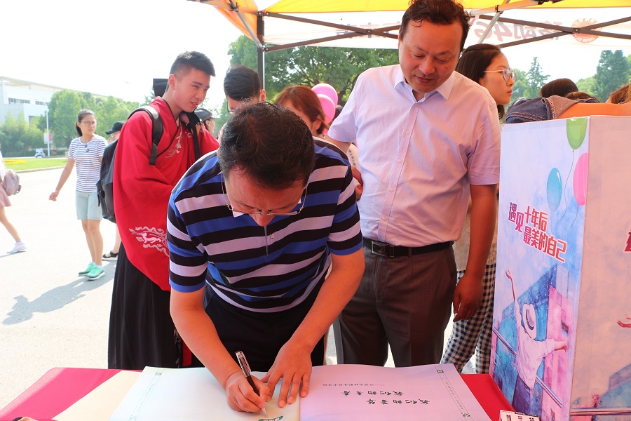 2018届毕业生纪念册上签名纪念。老师们也都为毕业生们写上了毕业赠言,一起投入时空信箱,希望十年后,校友们返校时,能够重新打开这些记载校友们青春的信件,一起回味曾经的青春时光。活动现场,同学们与老师们一起合影、留念,留下了最美好的青春印记。