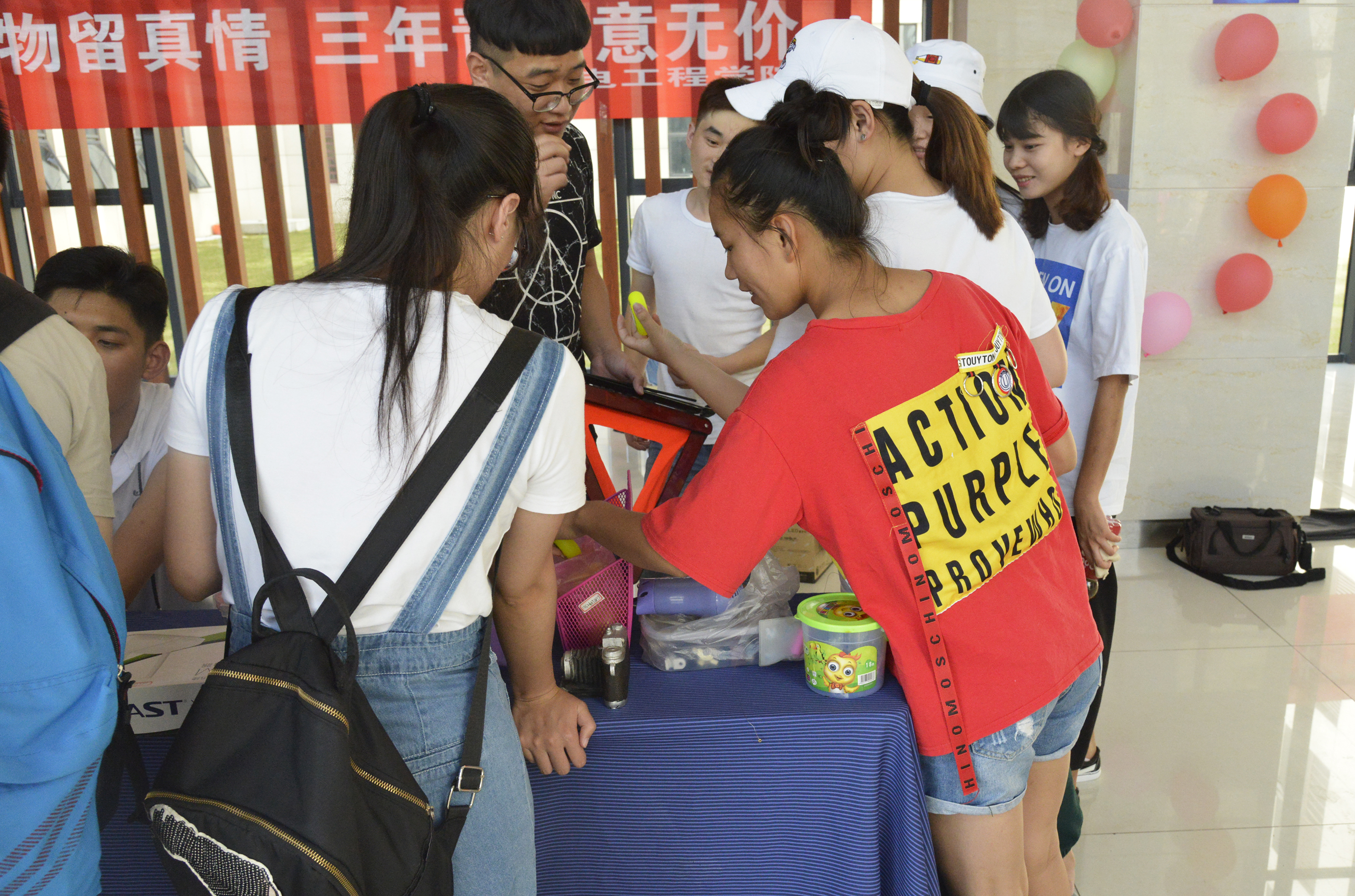 分团委在工科楼大厅举办了“一件旧物留真情叁年青春意无价”毕业跳蚤市场活动。