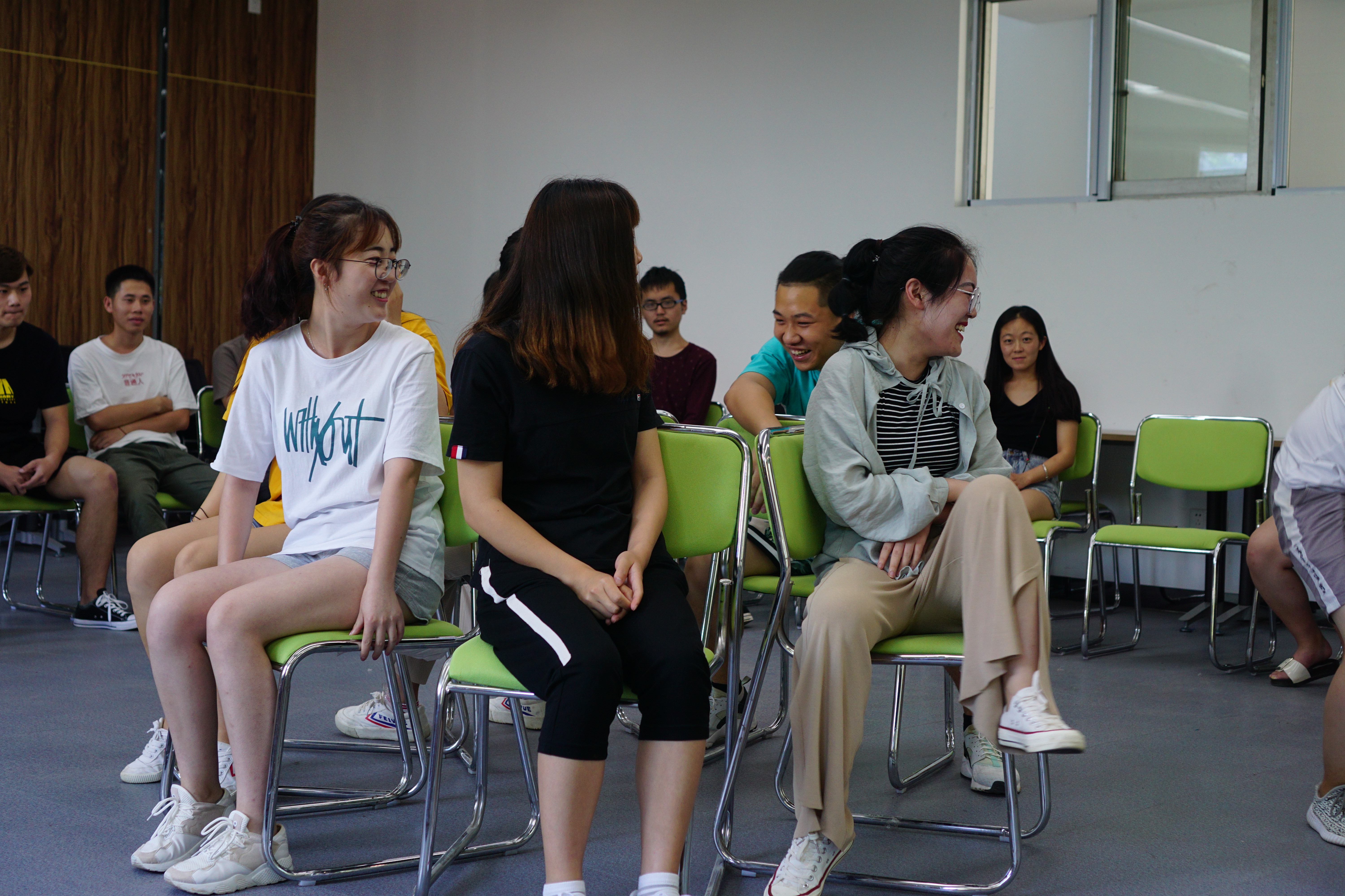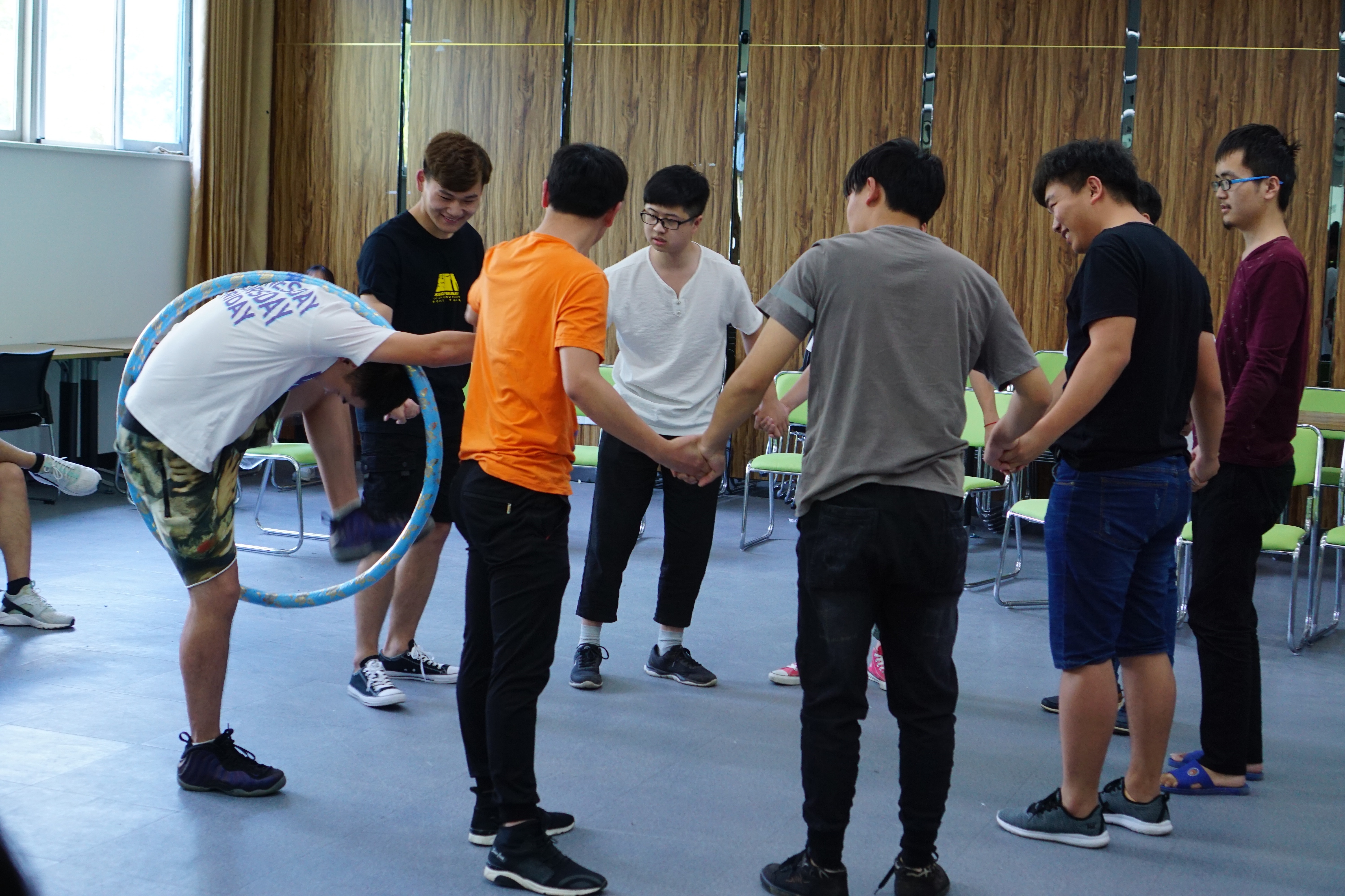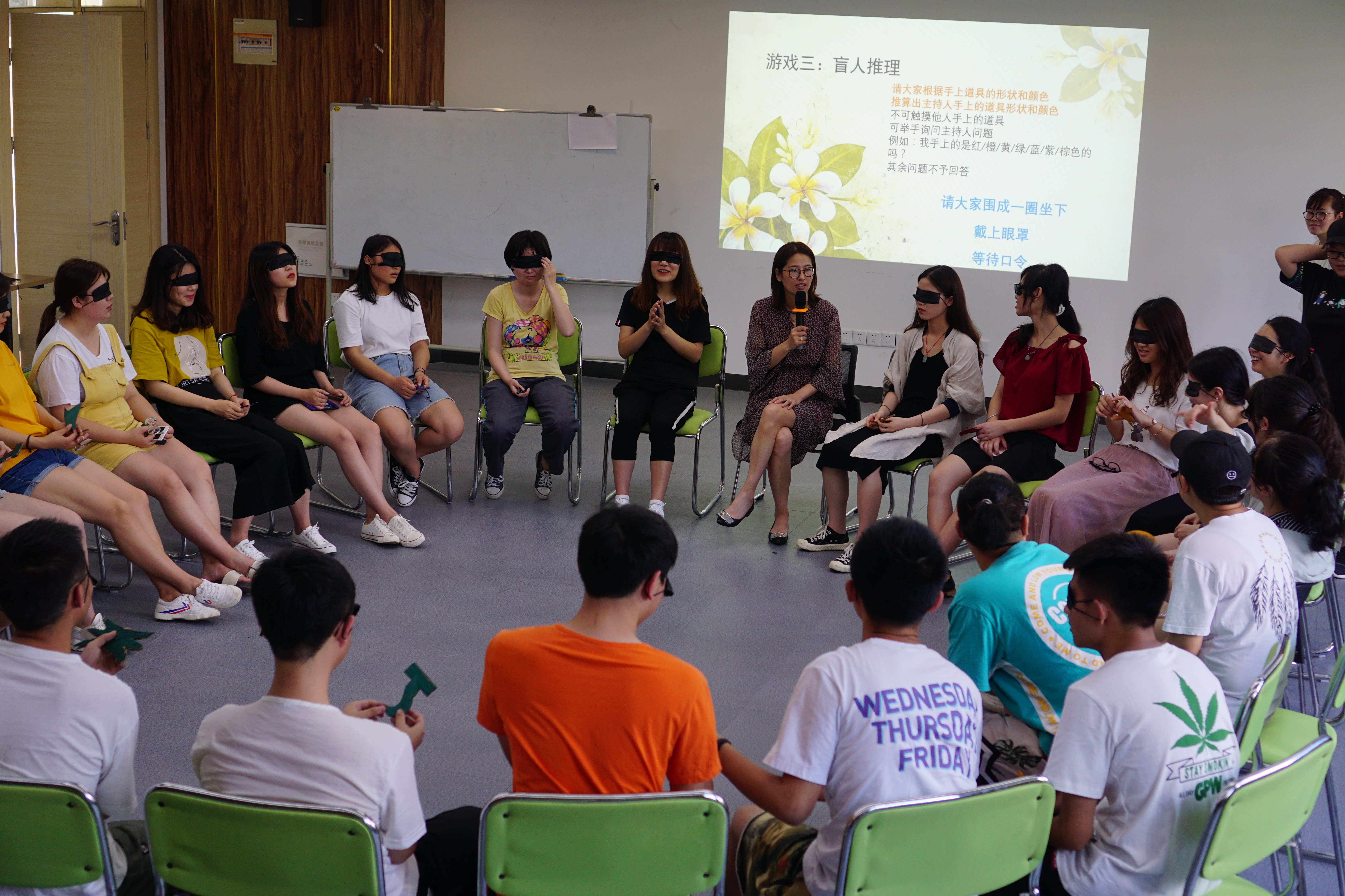 活动以“抢椅子”游戏热身与导入,通过“传呼啦圈”“解千千结”“盲人推理”等环节,进一步增强人际沟通和团队凝聚力的技能。同学们纷纷表示在游戏中意识到团队领袖和团队协助的重要性,对于增强班级凝聚力,提高自身的心理素质有重大意义。