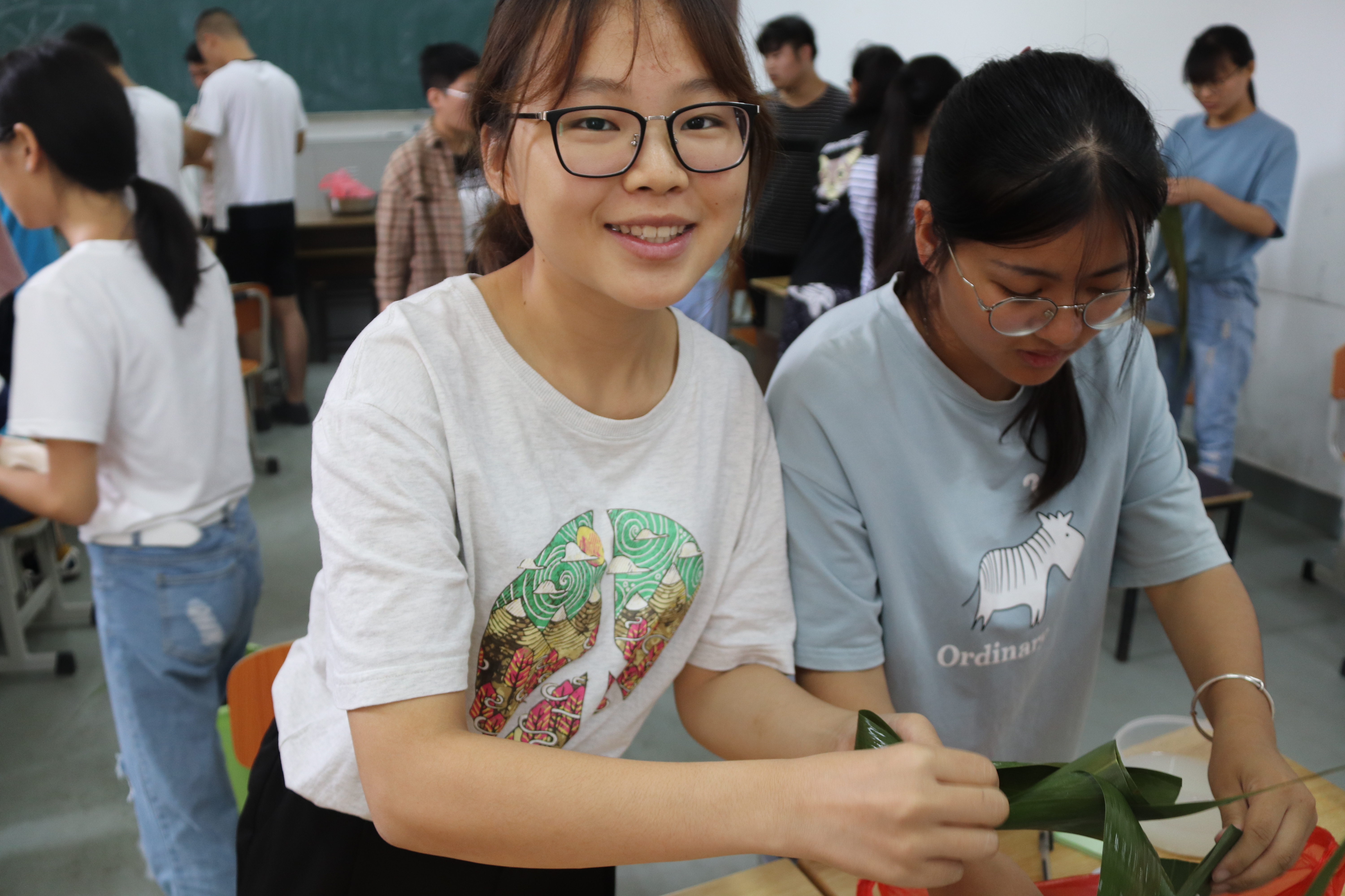 活动现场,糯米、蜜枣、粽叶、麻绳,花生一一摆放整齐,大家利索地开始包粽子。包粽子的过程充满搞笑片段,许多女生的操作堪称专业,双手轻卷粽叶,舀上米,左缠右绕,再把绳子系紧,糯米、大枣、粽叶在手中翻转飞舞,一个粽子就包好了。男生们也完美诠释了家庭妇男多面手形象,演变成了充满乐趣、互相学习的比赛现场。同学们的粽子各式各样,有三角粽子、方块粽子、桶型粽子。。