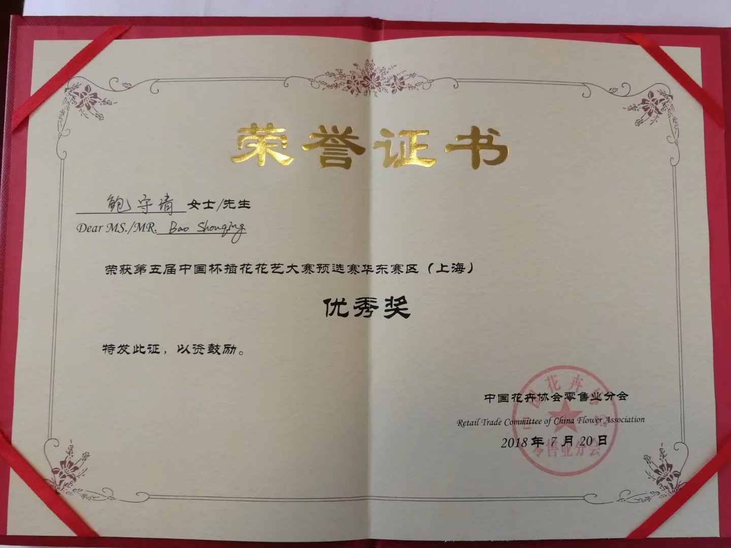7月20日,第五届中国杯插花花艺大赛预选赛华东赛区(上海)在申城举行,来自全国各地的35位选手在上海国际花卉时代广场(虹桥古玩城)争奇斗艳,我院风景园林色花堂 鲍守清同学以378.9总分第五的排位获得优胜奖,并取得今年11月在广州举行的第五届中国杯插花花艺大赛参赛资格。获得前20名的选手可以入选2019(北京)世界花艺大赛助手团队接受培训,与世界一流花艺师近距离(面对面)学习交流,为2019年世界花艺大赛选拔参赛选手做准备。