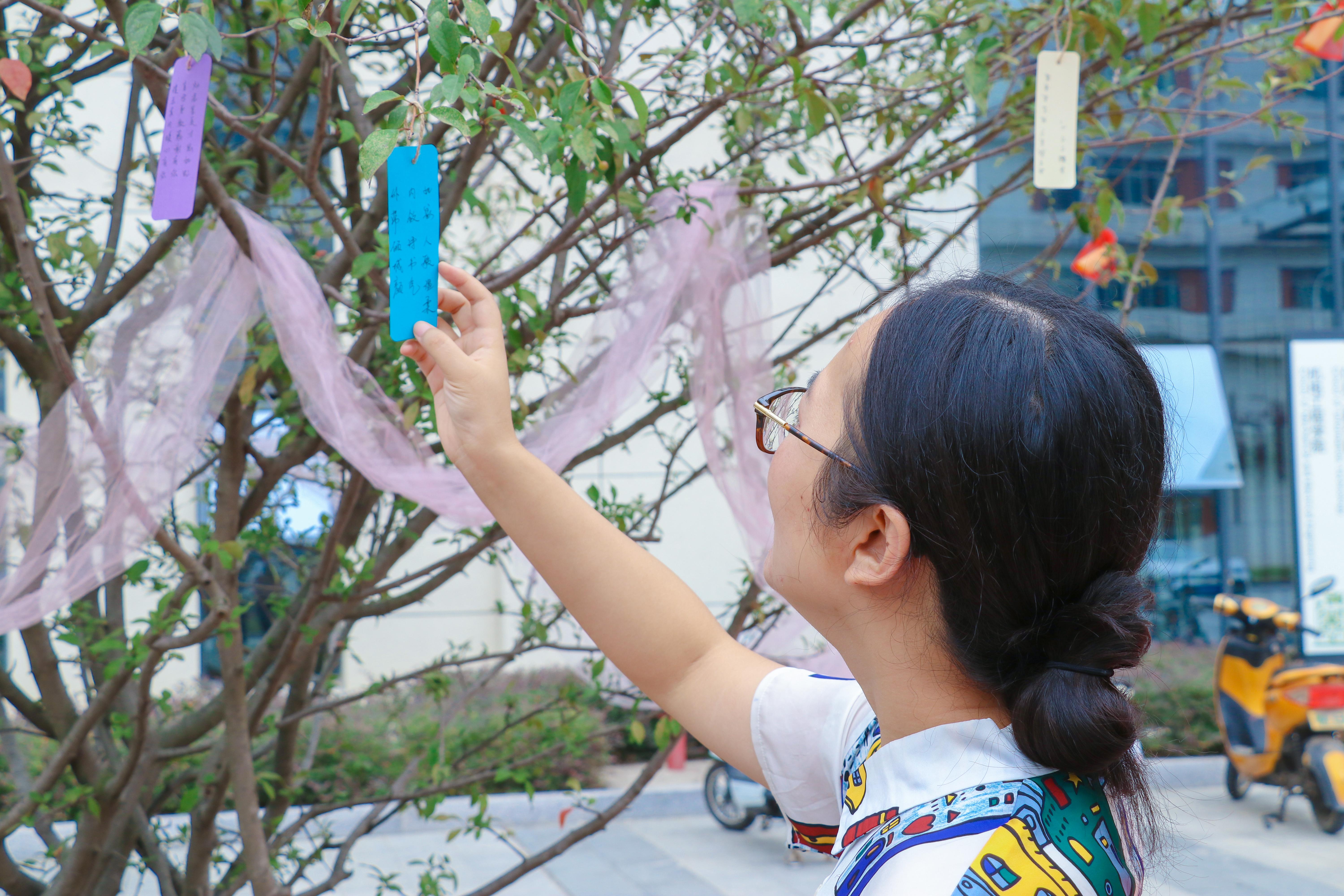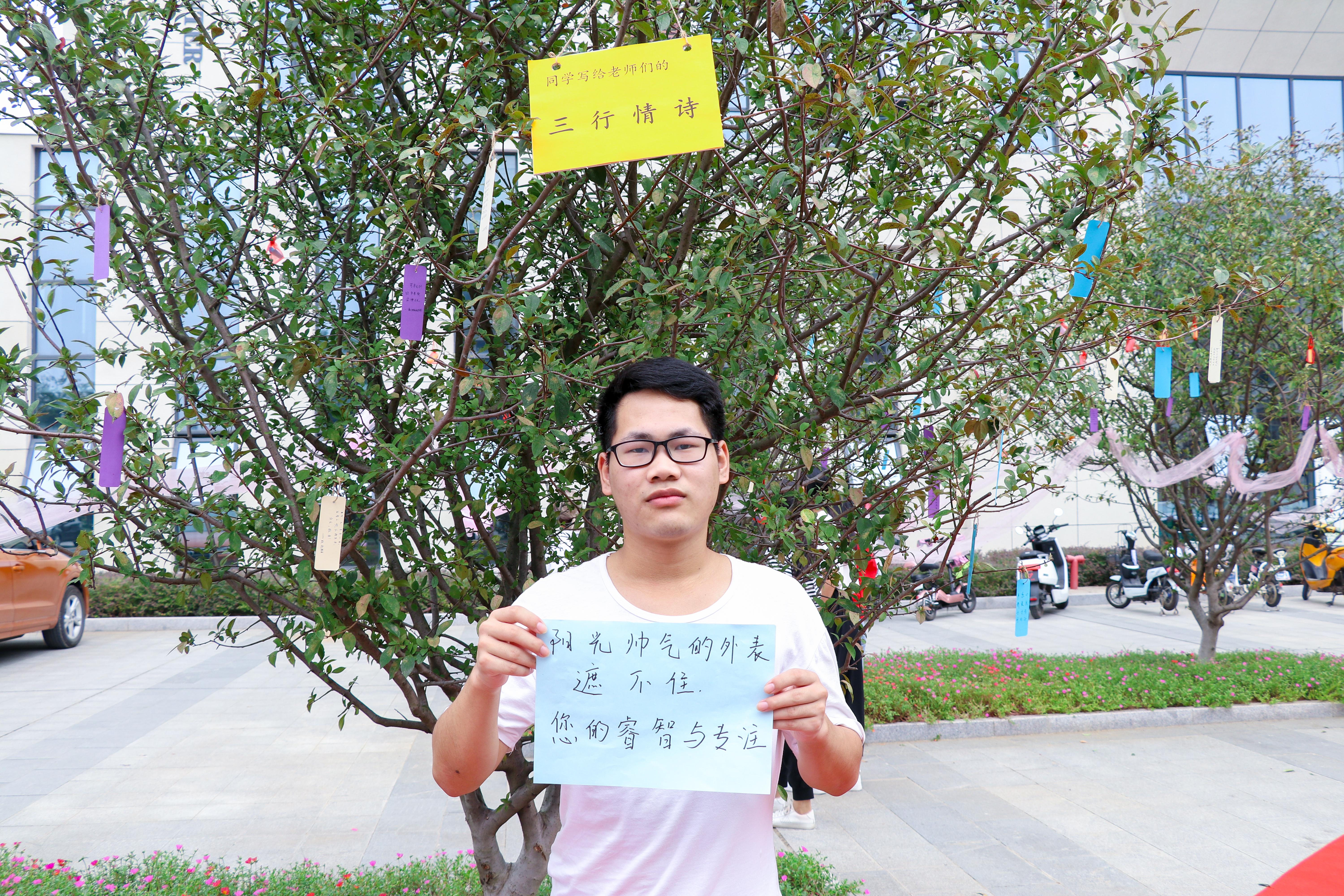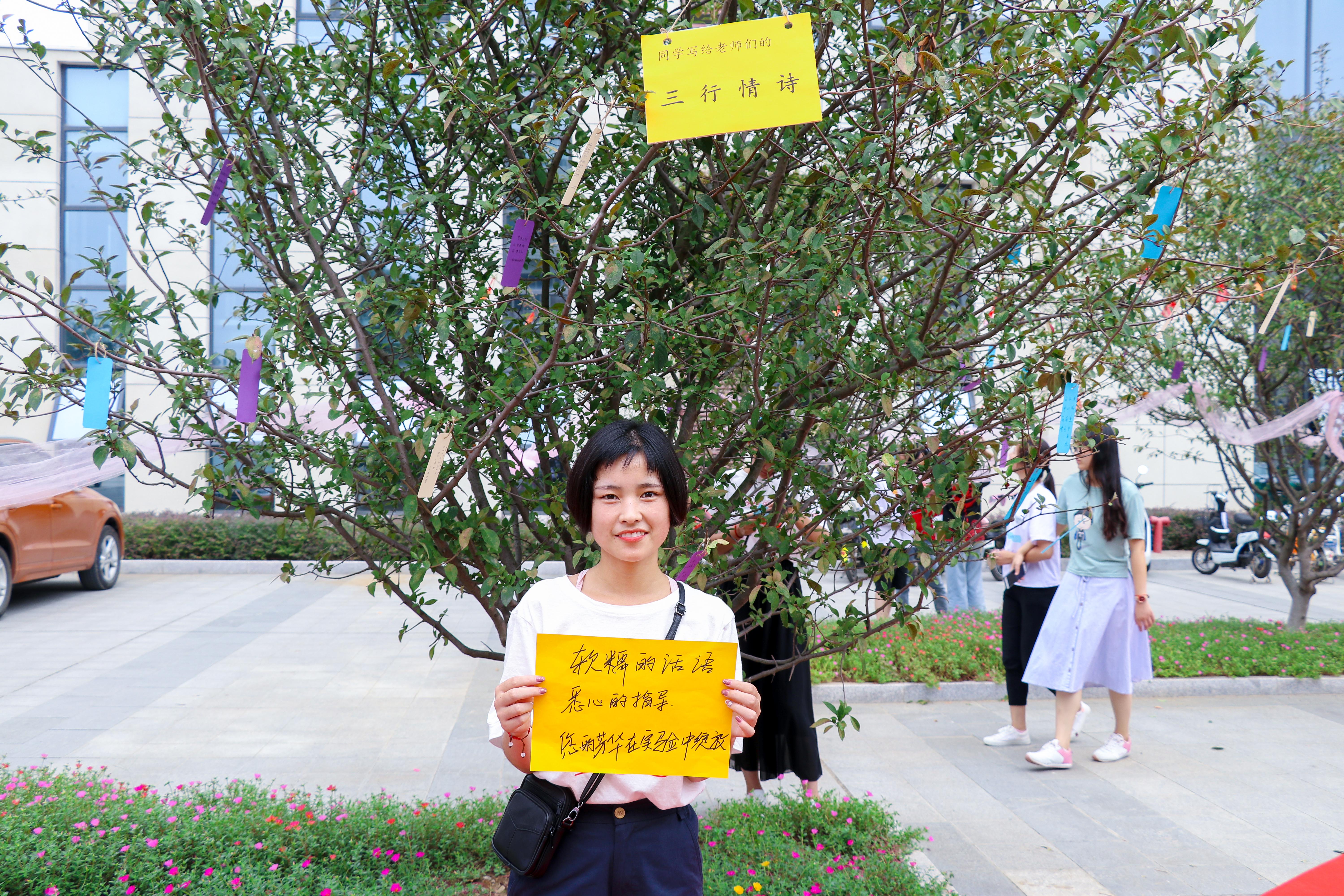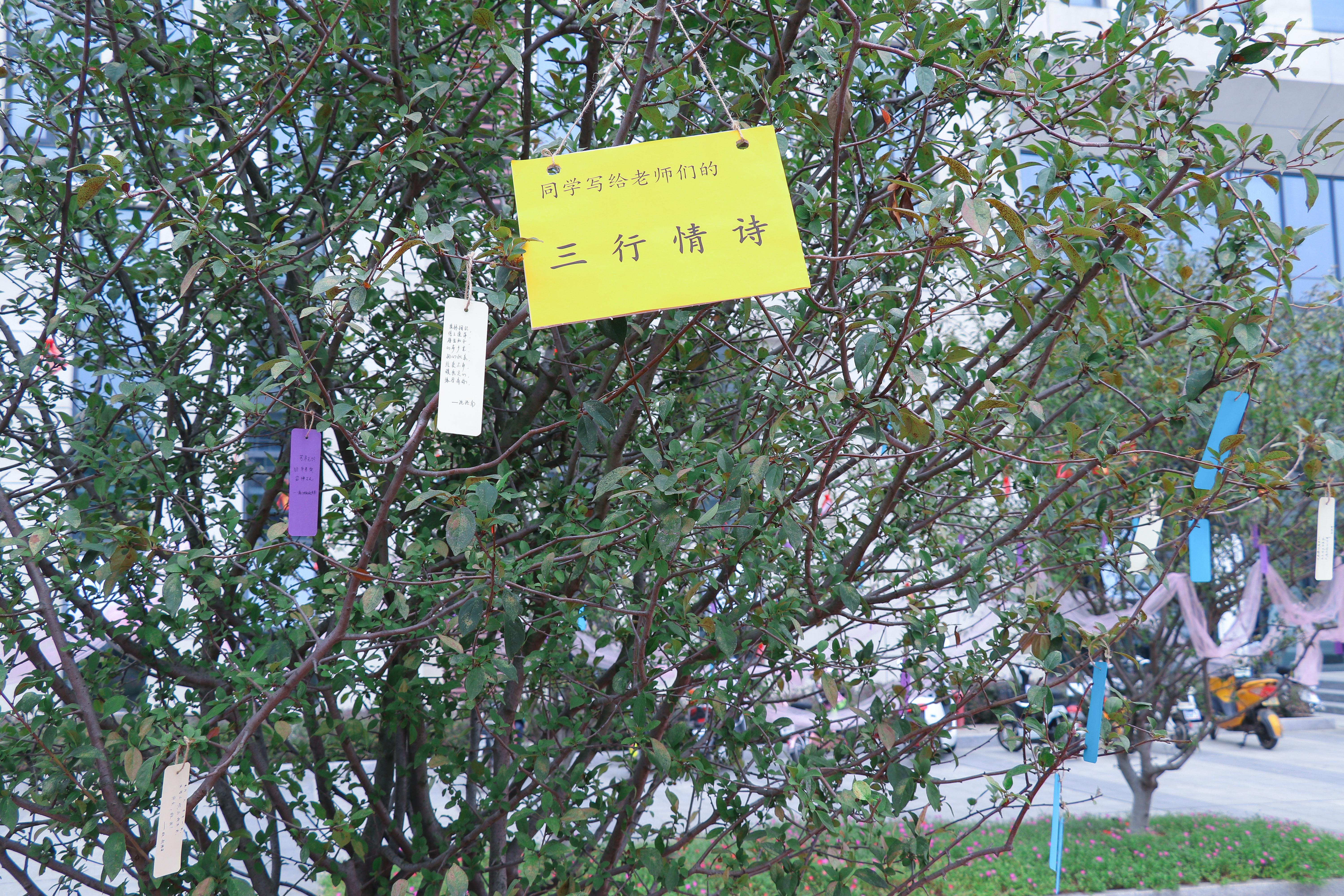 本次活动分为“三行情诗念师恩”和“锦囊妙计助学业”两个模块。活动中,同学将感谢师恩的三行情诗书签挂在丹桂树上,教师回以同学们助学“锦囊妙计”。三行情诗,或长,情深意切;或短,言简意赅。“锦囊妙计”充满智慧和哲理的人生感悟,同时也代表着老师们对学生寄予的殷切希望和美好祝福。活动引来师生驻足观看,互动现场温馨融洽。