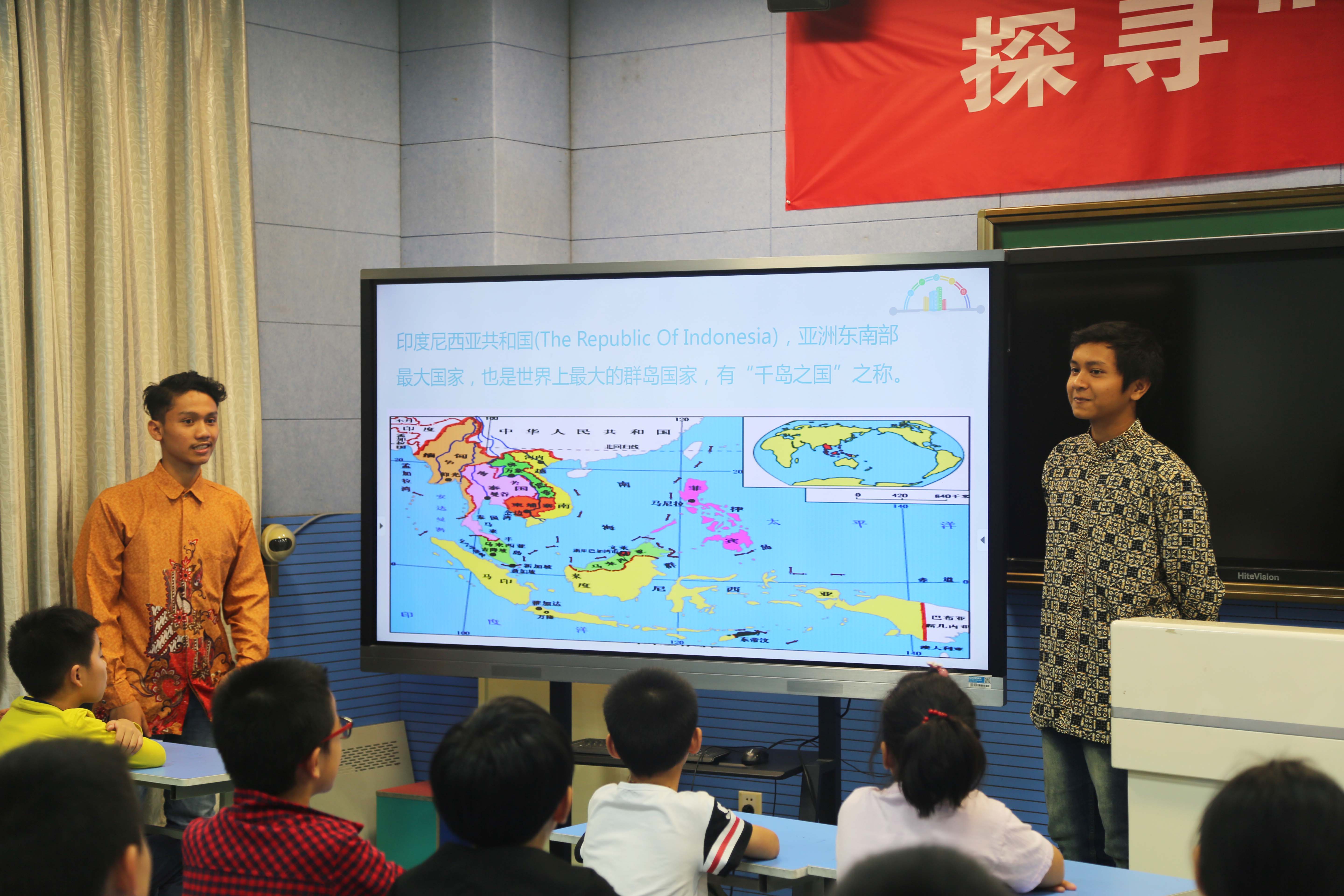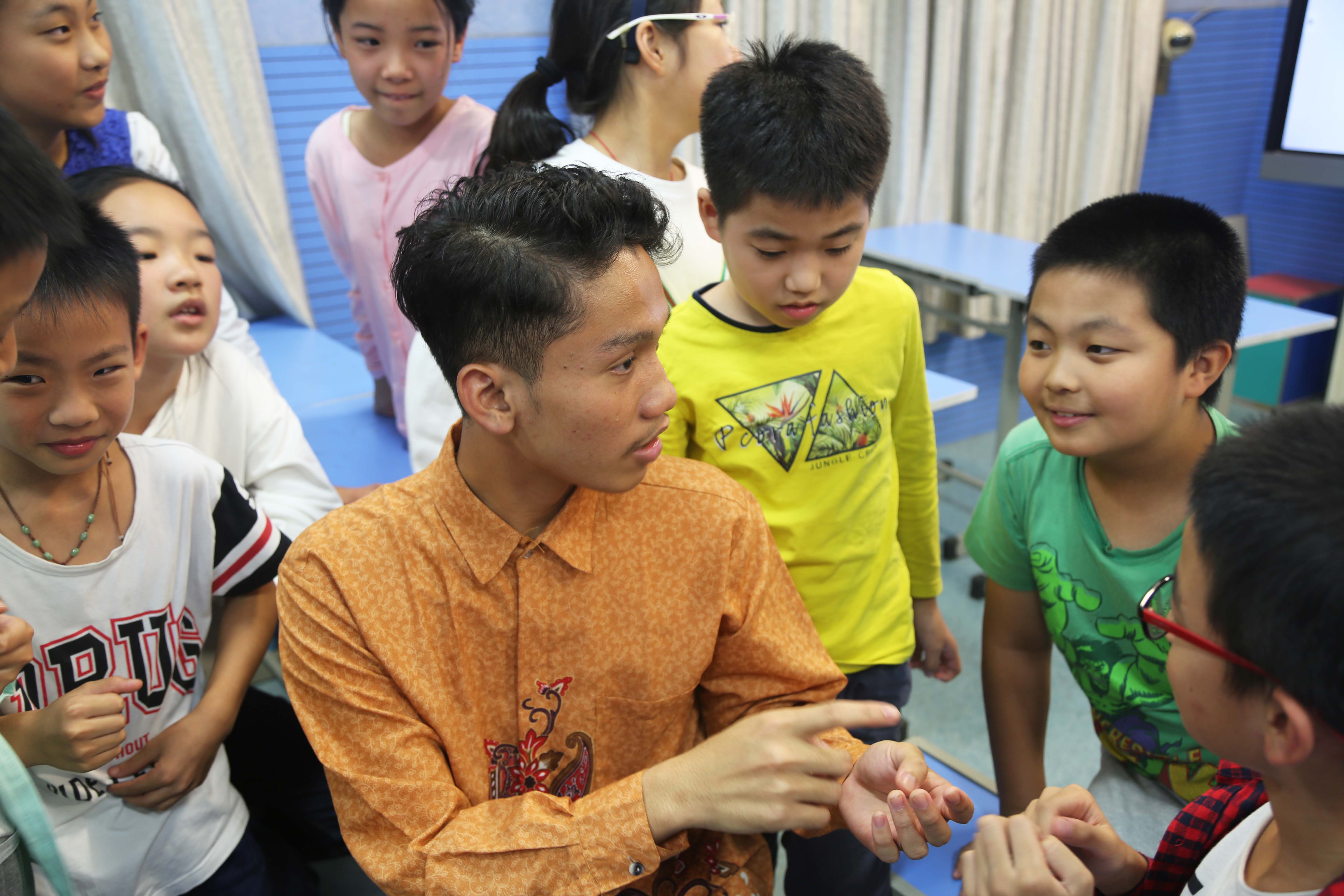 崇明小学的同学们用集体诗朗诵《水调歌头·明月几时有》欢迎志愿者和留学生的到来。法比亚和菲南通过PPT为大家开启了神奇的印尼之旅,他们在志愿者的协助下一边展示、一边讲解,运用多样化的交流方式,让他们在快乐愉悦的游戏氛围中了解印度尼西亚的国家概况、风土人情和美食美景。