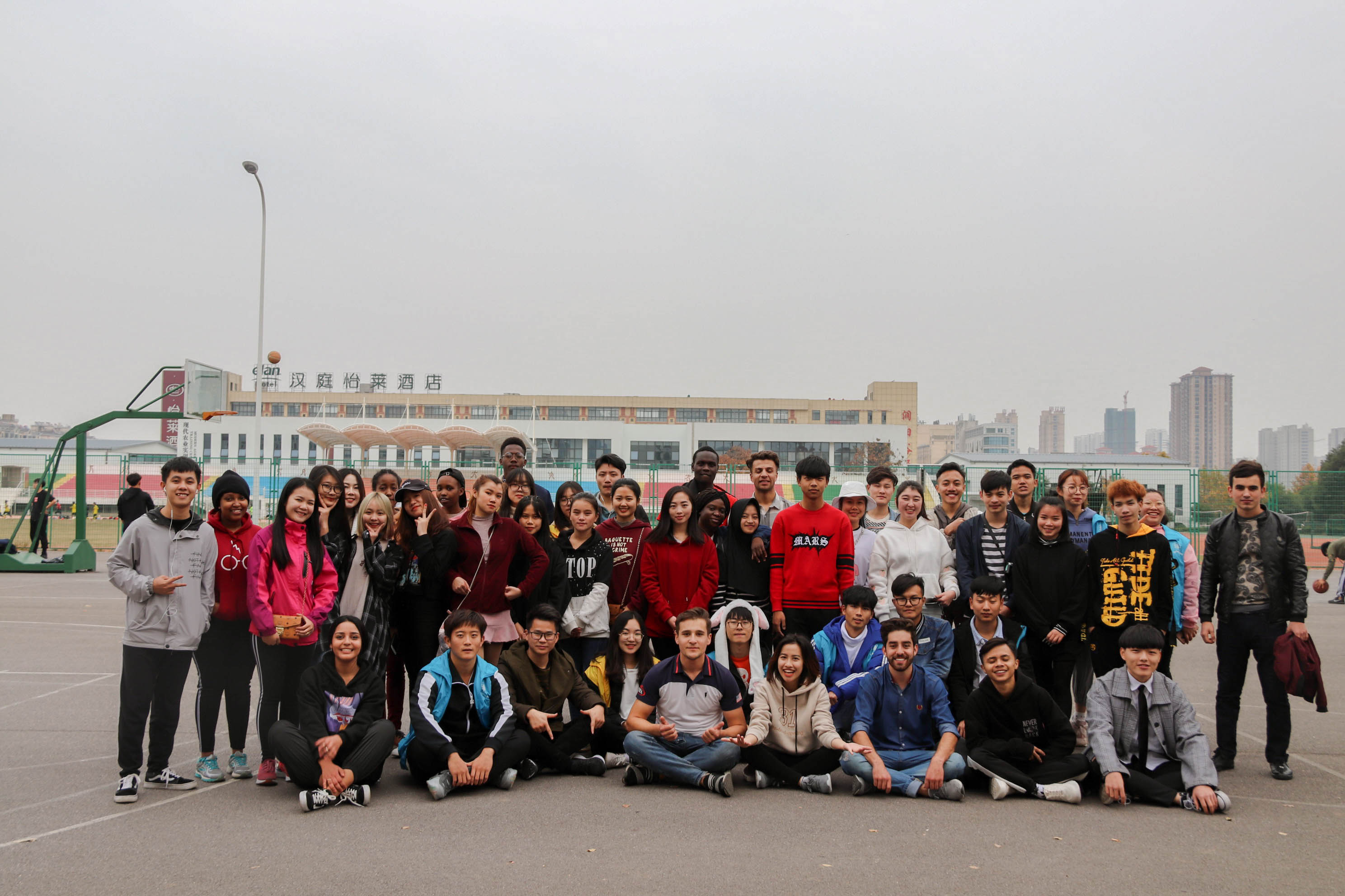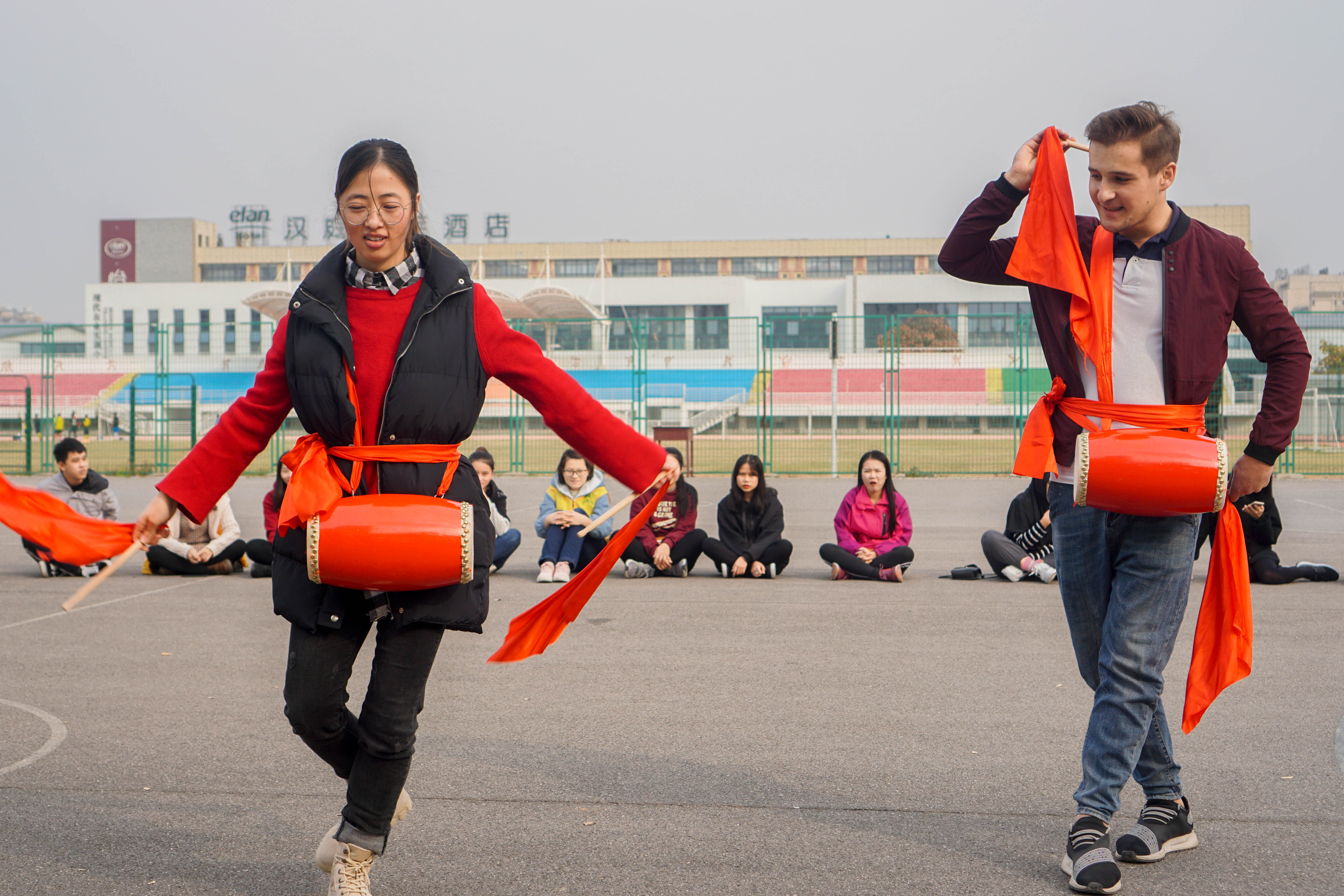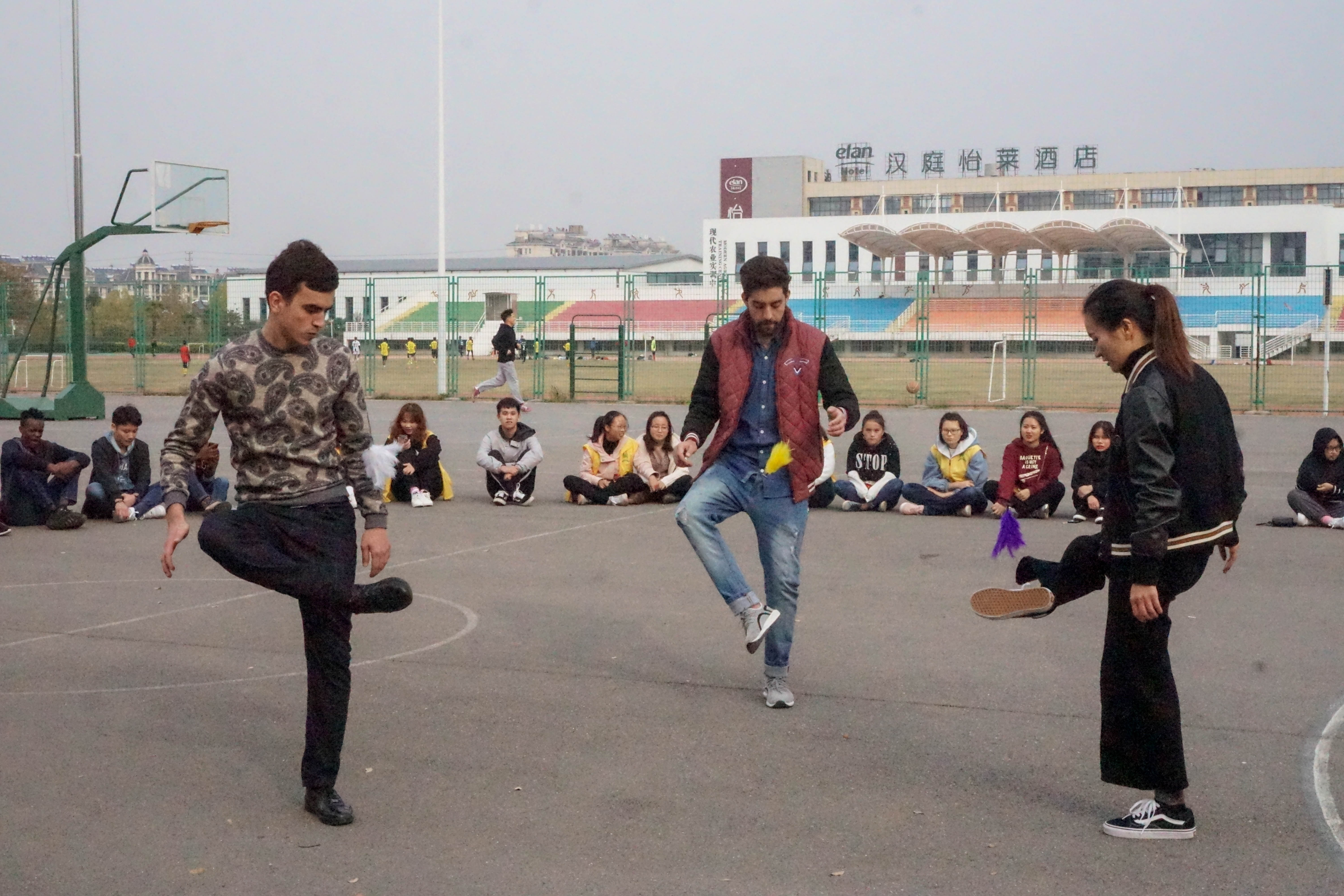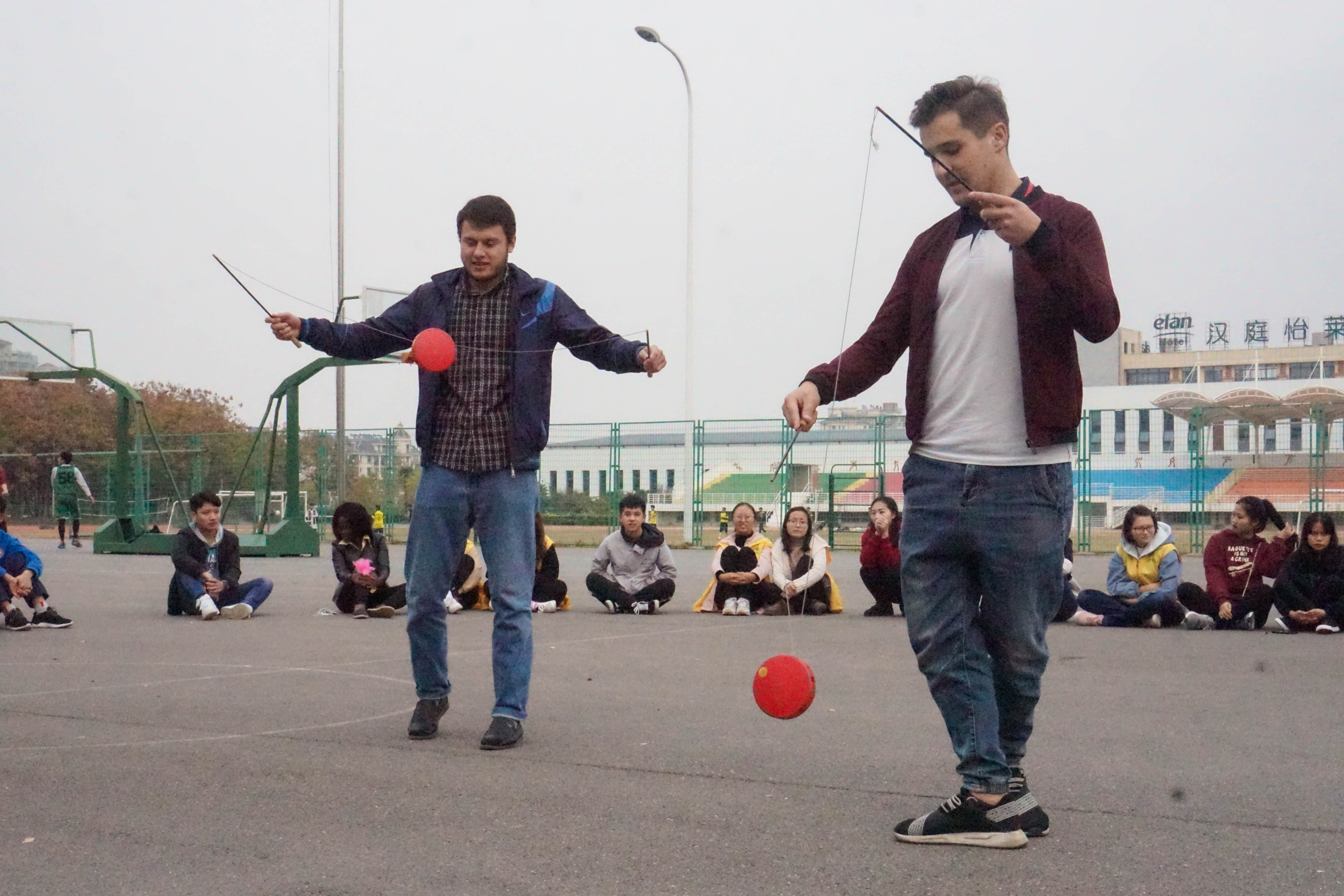中国传统技艺——花样腰鼓、空竹的表演,引得留学生们跃跃欲试,表演的同学细心讲解,使得留学生们很快掌握了技巧,腰鼓的击敲声、空竹的抖响声响切云霄,让在场的同学们连连称赞。在随后的趣味踢毽子和花样跳绳中,同学与留学生们都大展身手,使出浑身解数变换着各种花式,留学生们轻快活力的身影更是让同学们连连叫好。最后,在激烈的篮球友谊赛中结束了本次的活动。