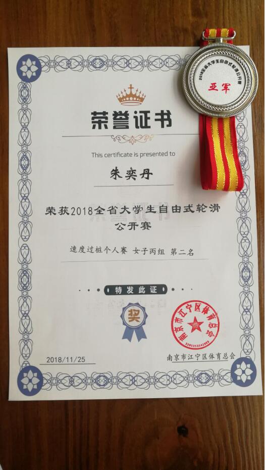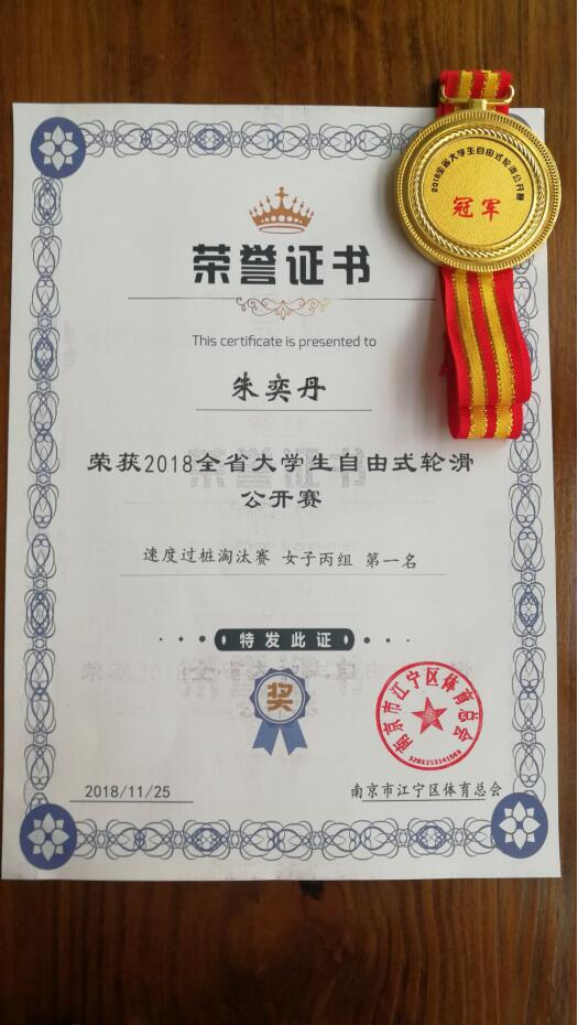 11月24日,体育部T-MAX轮滑社参加2018全省大学生自由式轮滑公开赛,经过激烈的争夺,朱奕丹同学荣获速桩淘汰赛女子丙组第一、个人计时赛女子丙组第二的好成绩,卢永鹏同学荣获花桩男子丙组第七的好成绩。
