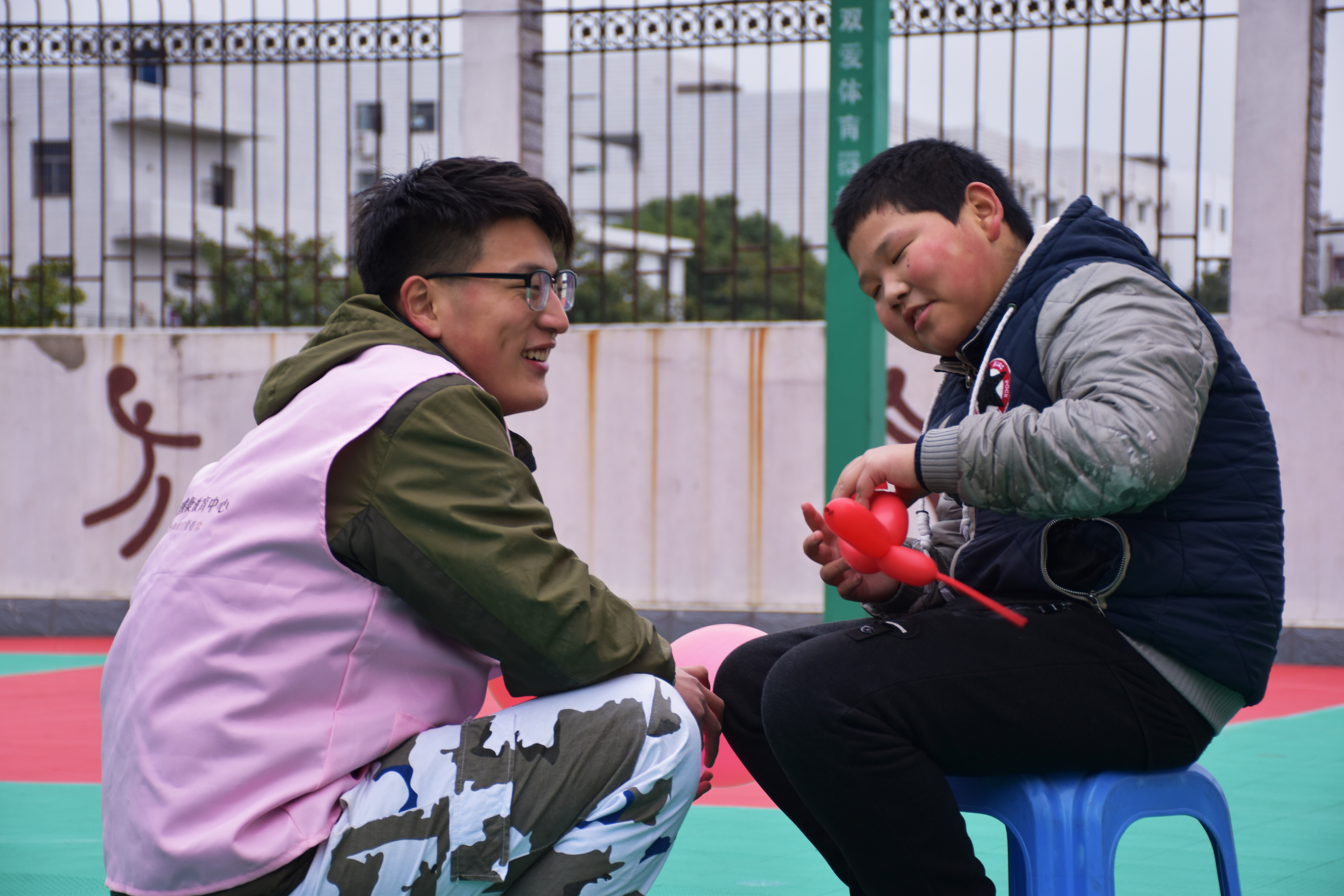 成员们通过陪伴特殊儿童玩游戏的方式增进彼此的交流,“老鹰捉小鸡”、“气球大作战”、“你是我的眼”、“画梦想”等多样的游戏让孩子们笑声不断。除集体游戏外还有一对一互动环节,小朋友们尽情玩耍,成员们贴心守护,操场上洒下一片欢声笑语,大家一起度过了一个温馨而又友爱的下午。