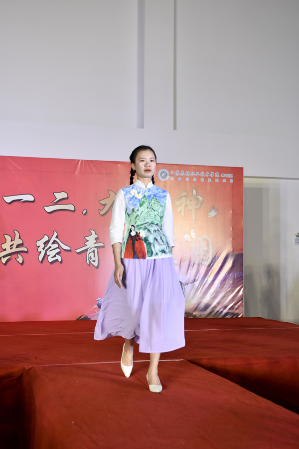 本次大赛以“爱国”“民族”“传统”“梦想”为主题,参赛选手以颜料彩粉手绘、传统扎染技艺或者旧衣物废弃等为原材料设计、制作成衣服,再由模特将作品展现于舞台上。有以京剧人物形象为主题,突出中国风的元素的《满堂花开三千醉》、有表现高洁自强不息精神的《花中君子》,有以黑色棉布为主,以敦煌神女飞天绘色图案为辅,代表着沉稳彰显希望的《子夜吴歌》,独特的设计,自由的造型,在绚丽的作品展示中,各设计师介绍了设计的主题和理念。现场,同学们还以三行诗朗诵、横幅签名的形式表达了自己的爱国热情。